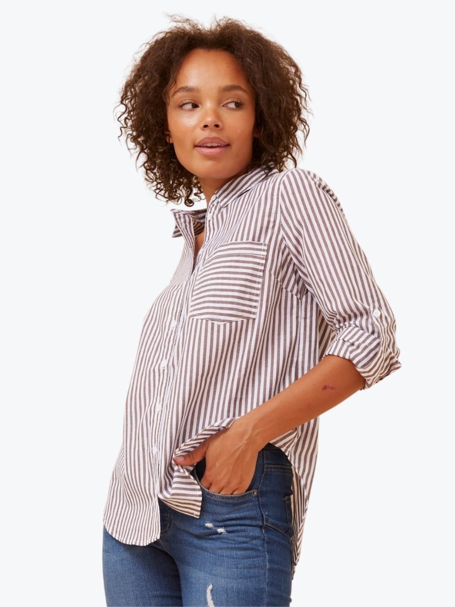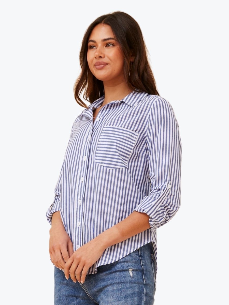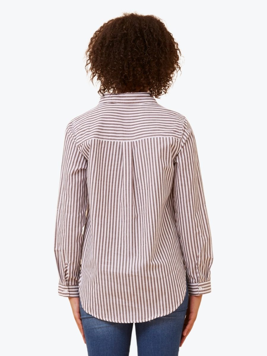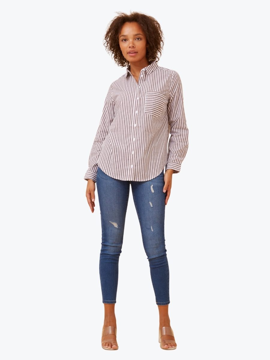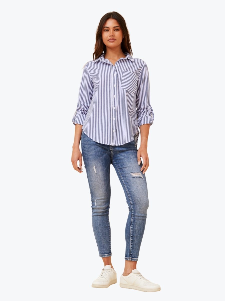 Timeless, tailored, and endlessly wearable – the Stripe Shirt from Caroline K Morgan is your wardrobe’s quiet hero. Designed with thoughtful details and a flattering silhouette, it transitions effortlessly from relaxed weekends to polished weekdays. It is a classic button through to the collar shirt, with full length cuffed sleeves that can be tabbed up for versatility. The chest pocket adds a subtle, practical accent, while the curved high-low hem offers coverage and movement. Pair it with denim for casual ease or tuck it into tailored trousers for a crisp, confident look.