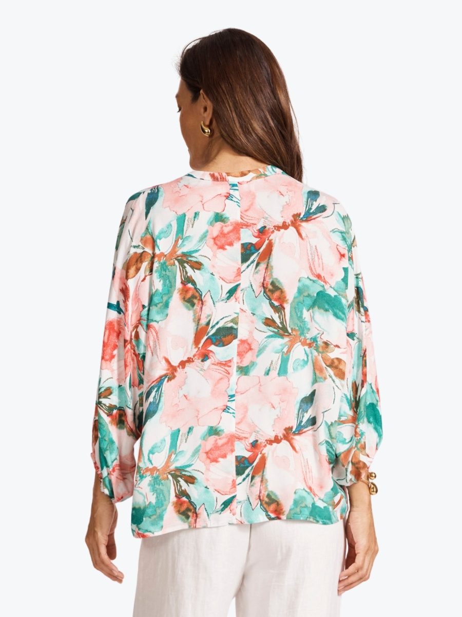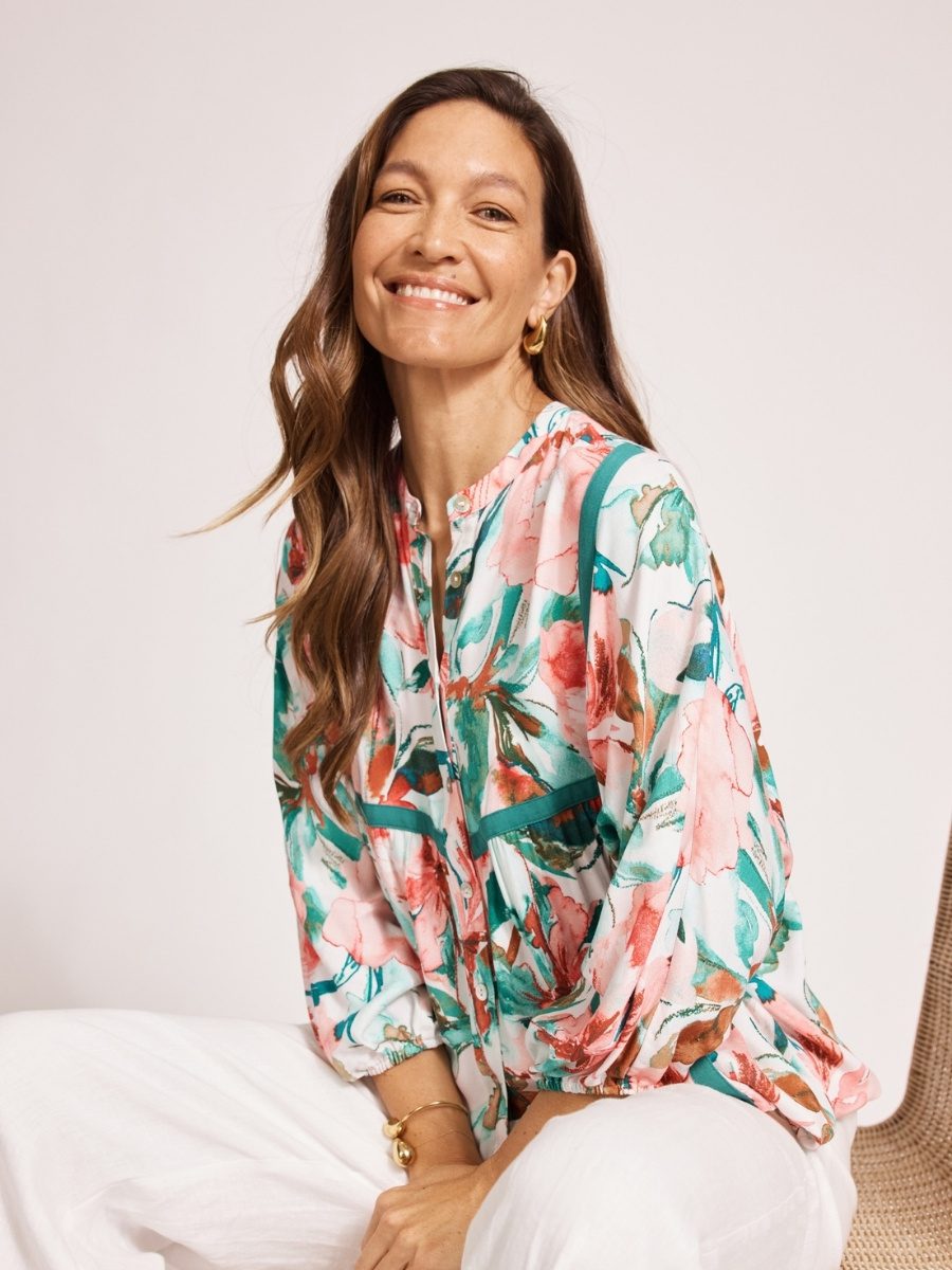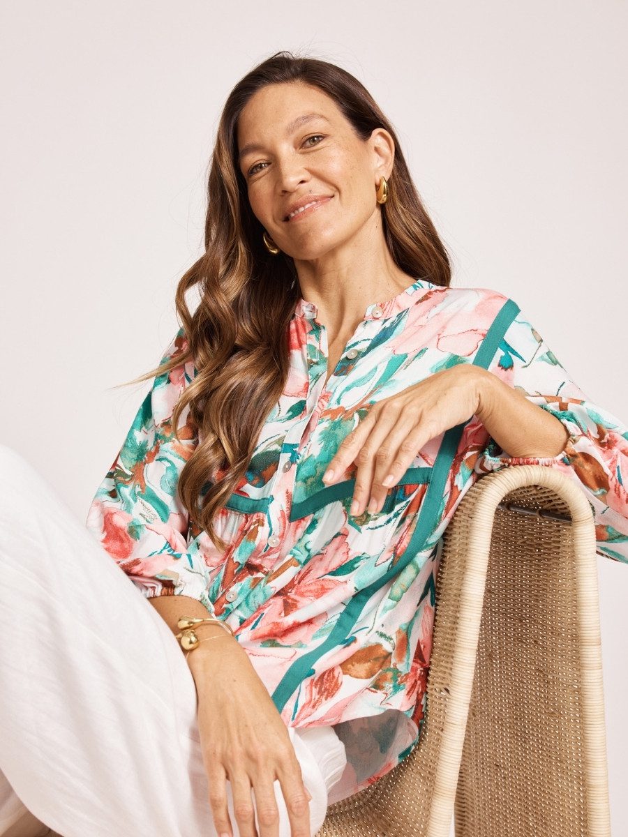 Elevate your everyday with the Alegria Spliced Top from Eb & Ive. This statement blouse is crafted from lightweight viscose fabric for effortless wear. Designed with contrast spliced detailing, a shell button-through front, and soft balloon three quarter sleeves, it offers a relaxed fit with gentle structure and flow. Pair it with linen pants or a maxi skirt for a refined, polished look.