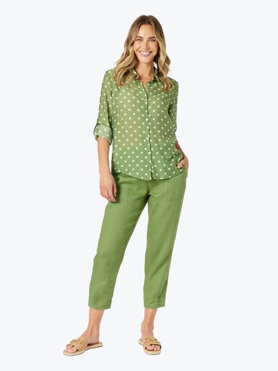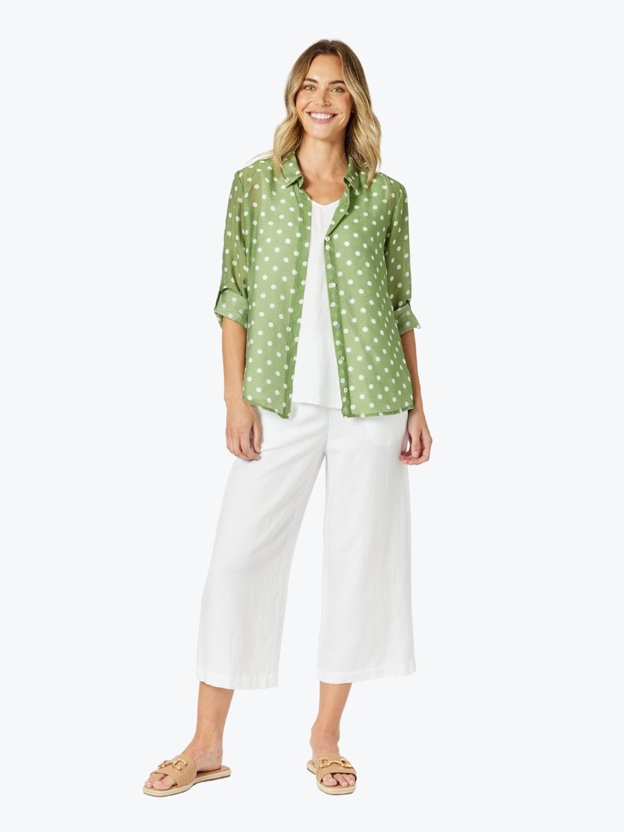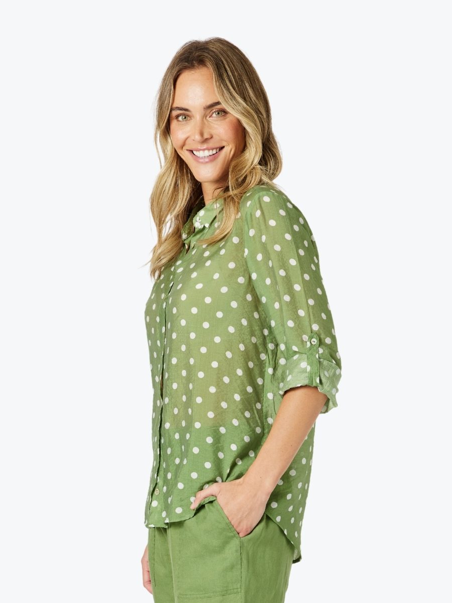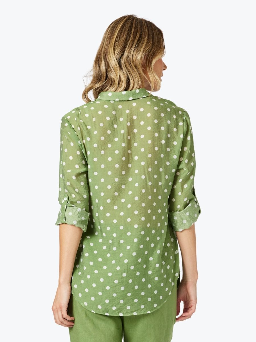 Light, breezy, and effortlessly stylish – the Basil Spot Sheer Shirt from Gordon Smith brings a playful twist to a timeless classic. With its fresh basil green base and crisp white spot print, this sheer layer adds personality without overpowering.