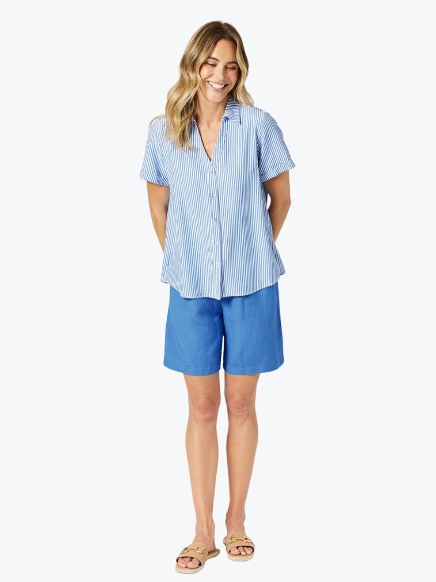 Classic with a twist, the Piper Short Sleeve Stripe Shirt from Gordon Smith reimagines timeless shirting with subtle texture and modern ease. It is creafted from a soft cotton blend fabric with a little bit of stretch for comfort and wearability, and the stripe has a subtly textured finish. It features a smart collar and button-through front for a clean, structured look, white the short sleeves keep it breezy and seasonally adaptable. There are small side splits for ease of movement and relaxed styling, and the hip-length cut flatters and layers effortlessly. True to size and endlessly wearable, the Piper Short Sleeve Stripe Shirt pairs beautifully with tailored pants for a refined silhouette or relaxed shorts for weekend ease. It’s understated, elevated, and ready for wherever the day takes you.