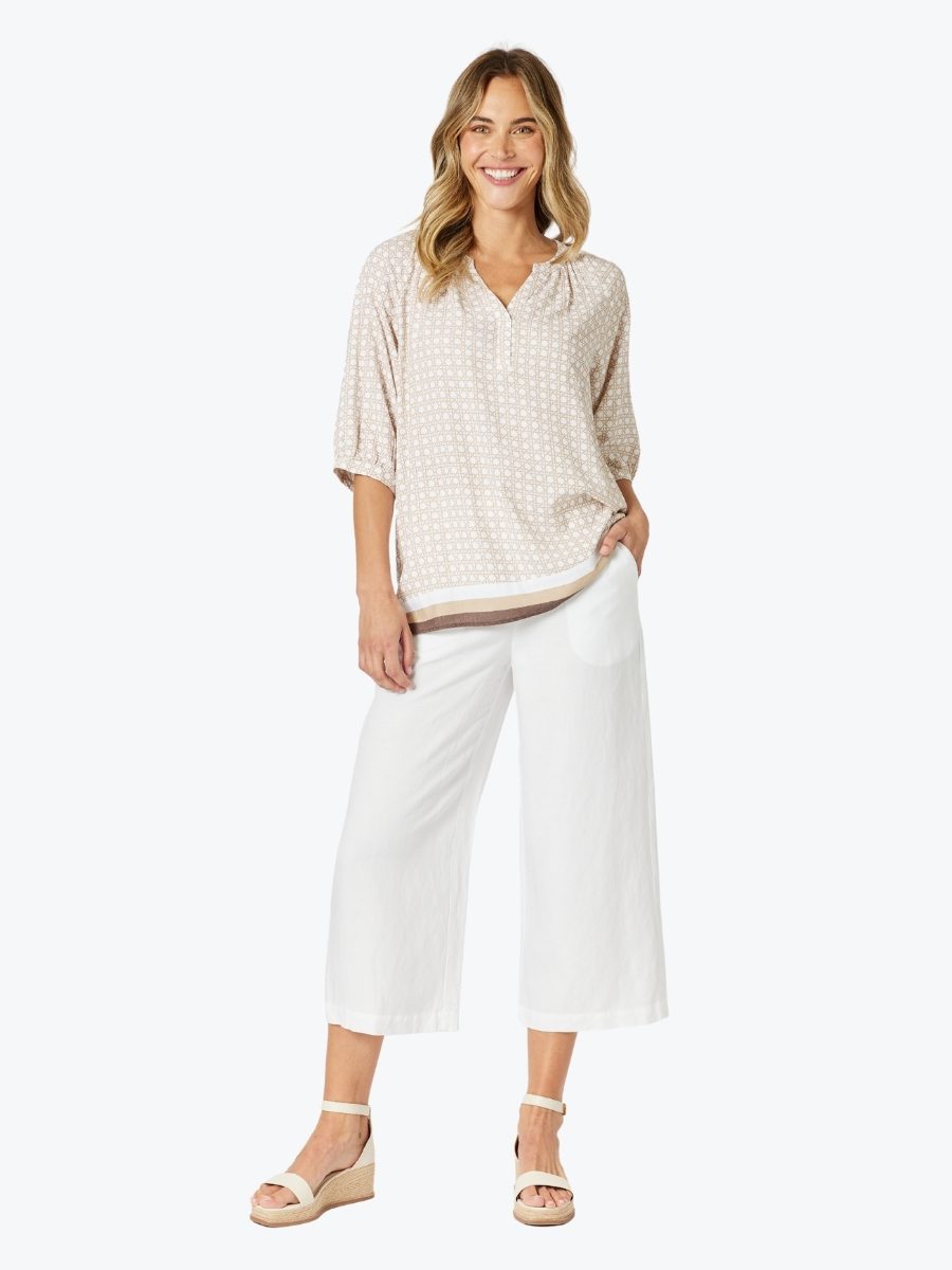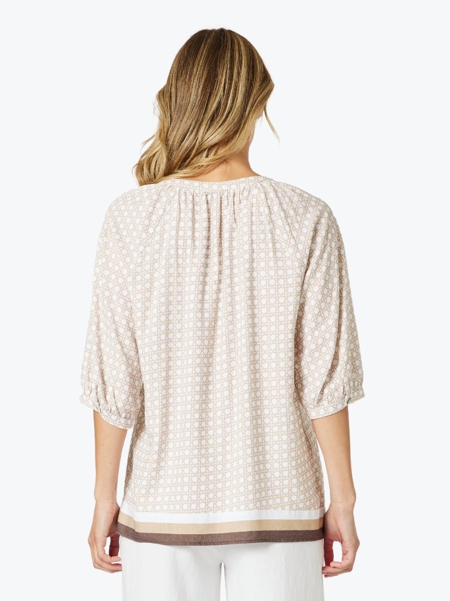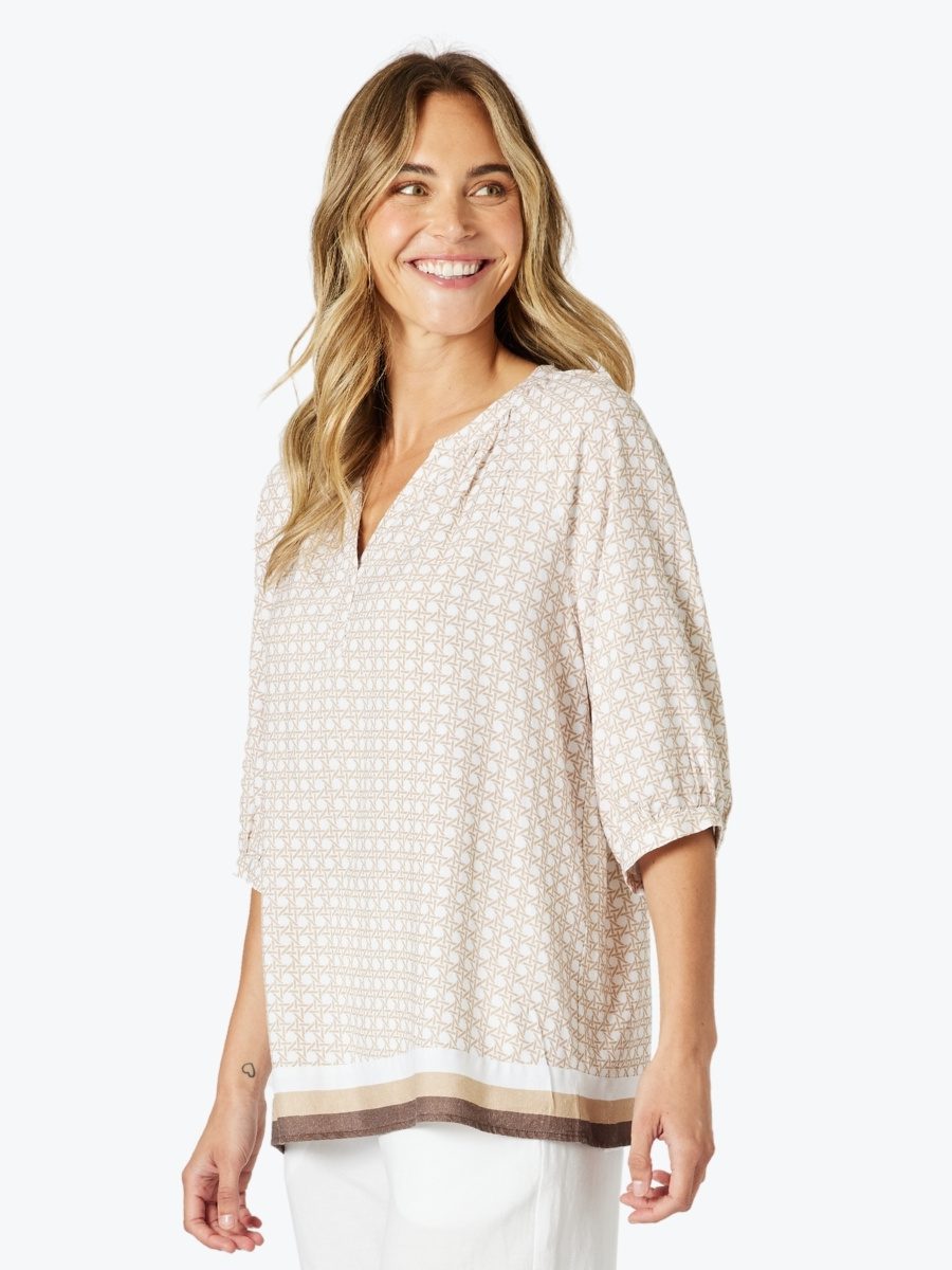 Infused with quiet charm and refined detail, the Rattan Top from Gordon Smith brings natural elegance to your wardrobe. Crafted from a soft viscose/linen blend, it features a gentle beige and white geometric print that evokes coastal serenity. Elbow-length sleeves with button cuffs offer easy coverage, while the contrasting border hem adds a tailored finish. Whether styled with relaxed trousers or dressed up with crisp denim, it’s a versatile piece that transitions effortlessly from casual to polished.