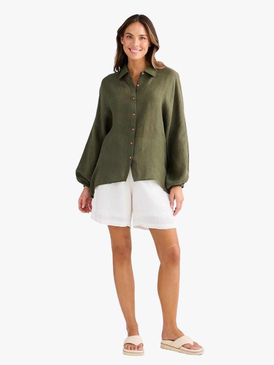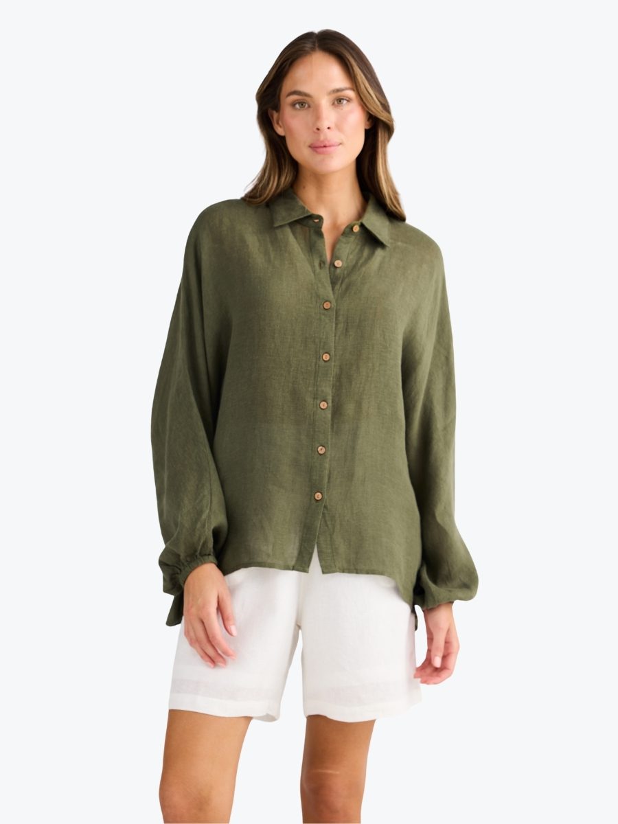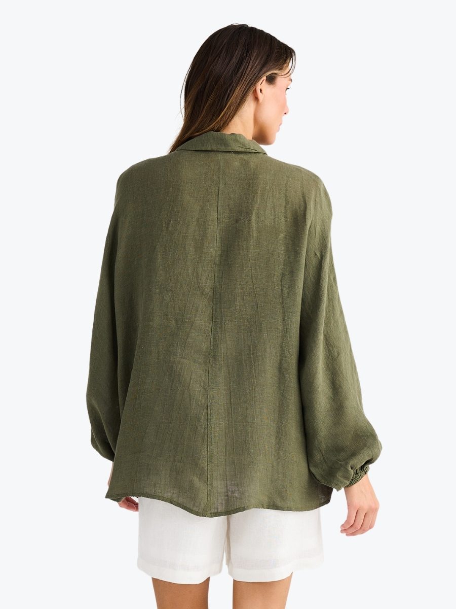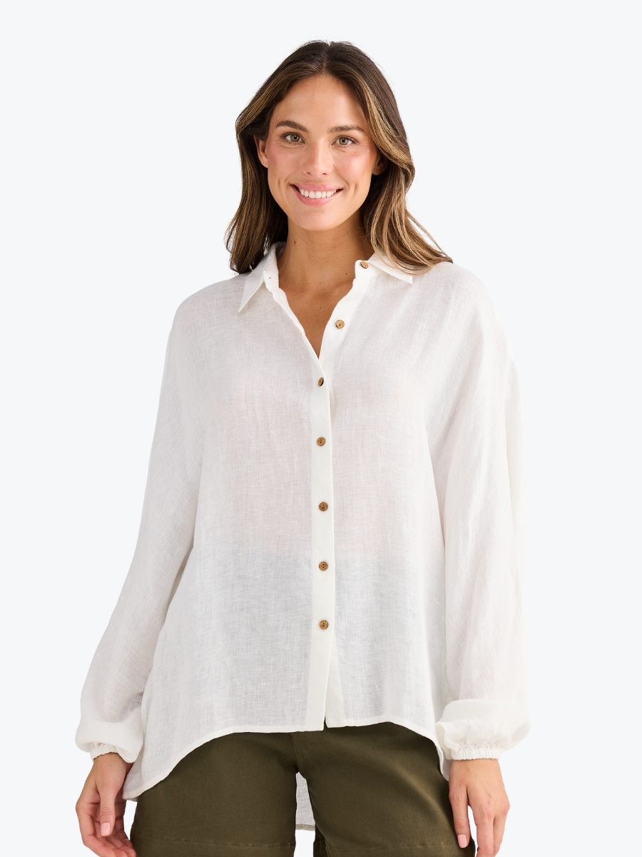 The Cliffside Shirt from Holiday is the classic shirt you need this summer. Made from a light and breathable 100% linen gauze, this versatile over-sized shirt can be worn out as is, knotted or tucked. It’s also great as a summer sun cover up while keeping cool. It features a collar and button up front, and full length dolman sleeves with button up cuffs. This Holiday favourite is sure to be on high rotation this season!