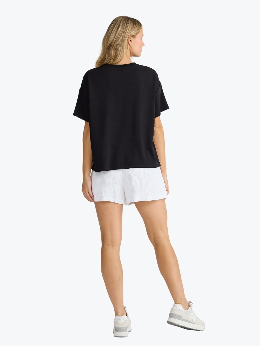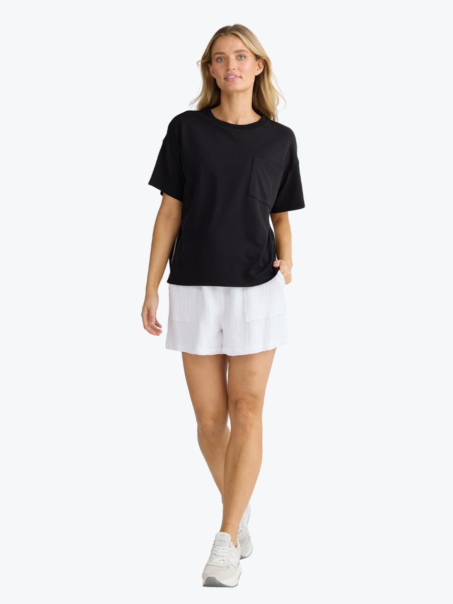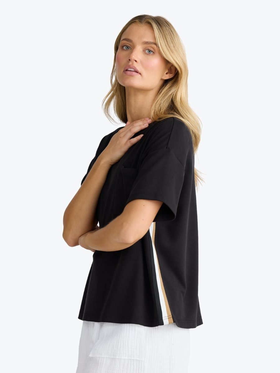 Soft, breathable, and designed for movement, the Free Time Tee from Homelove brings casual comfort with a modern edge. This jersey top is crafted from soft double knit jersey, and features a relaxed silhouette with a sporty stripe trim for a touch of flair. The ribbed neckline and patch pocket keep it classic, while the side detail adds a fresh finish. For a co-ordinated look, pair it back with the Hometime Pants.