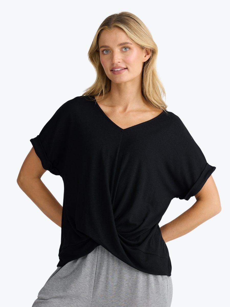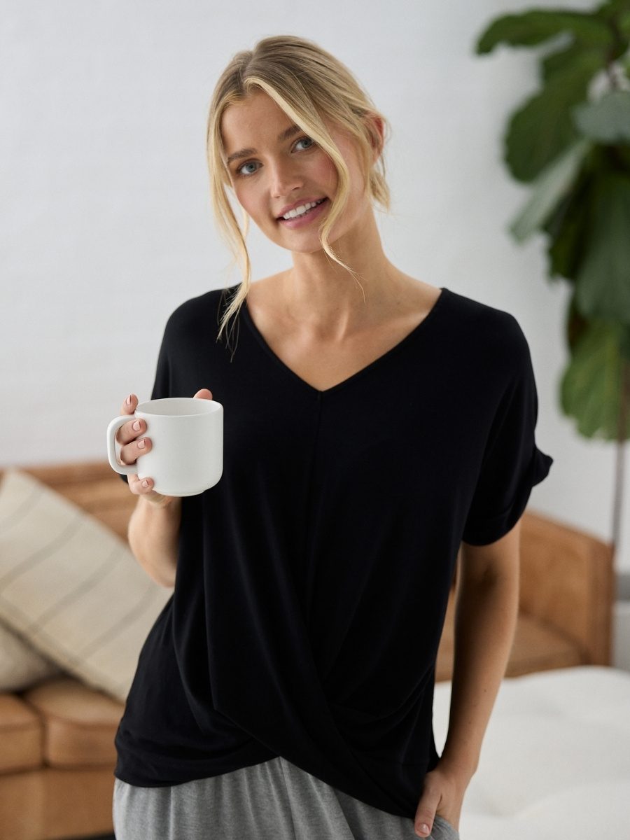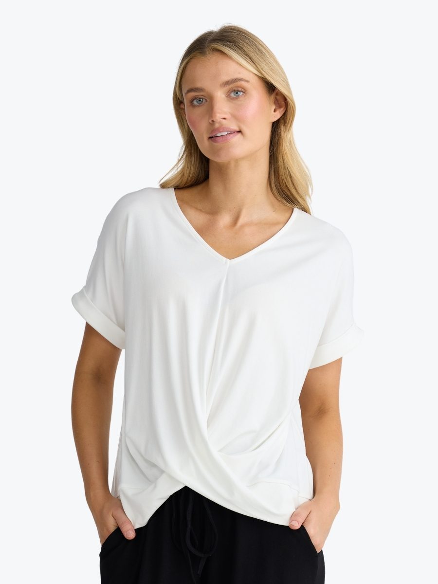 Meet your new go-to: the Rapture Tee from Homelove. This tee is a soft jersey top with a relaxed silhouette and a clever twisted front that adds shape without cling and does all the styling for you. The V-neckline and short sleeves keep it cool and casual – perfect for pairing with wide leg pants or your favorite denim.