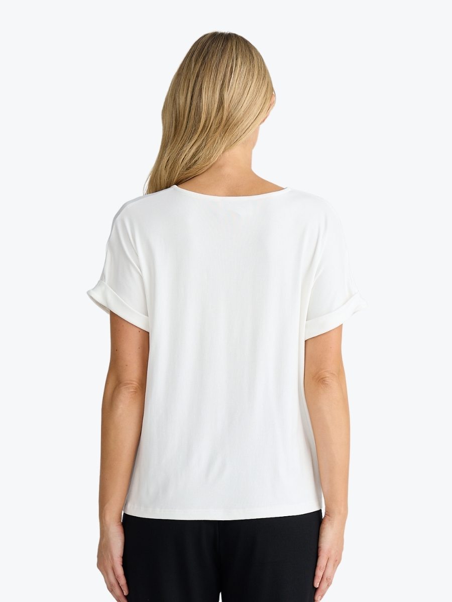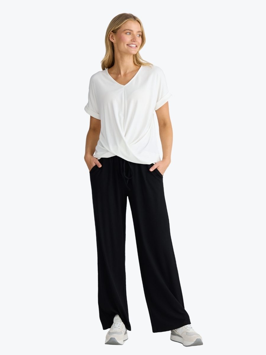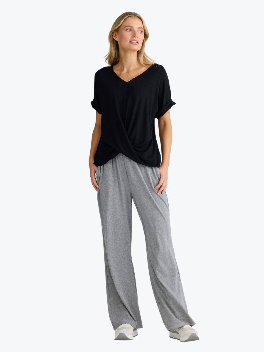 Meet your new go-to: the Rapture Tee from Homelove. This tee is a soft jersey top with a relaxed silhouette and a clever twisted front that adds shape without cling and does all the styling for you. The V-neckline and short sleeves keep it cool and casual – perfect for pairing with wide leg pants or your favorite denim.