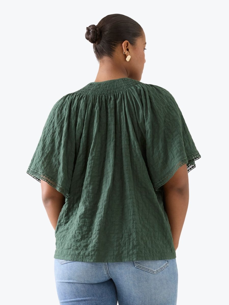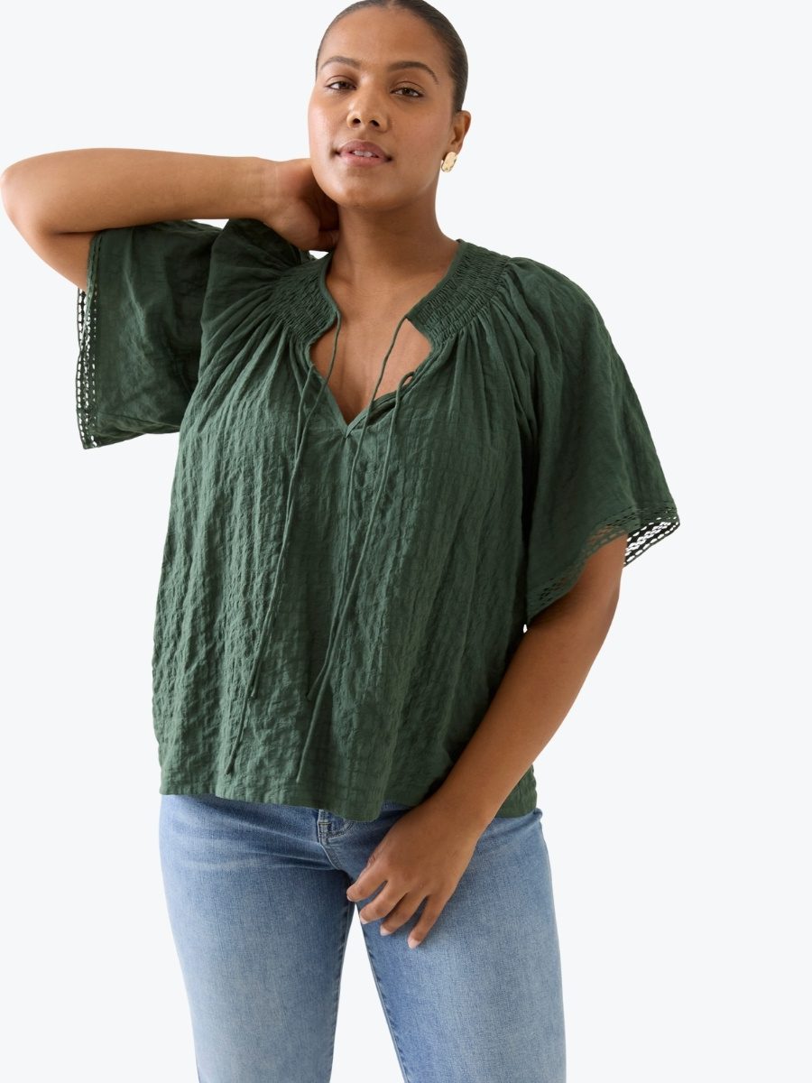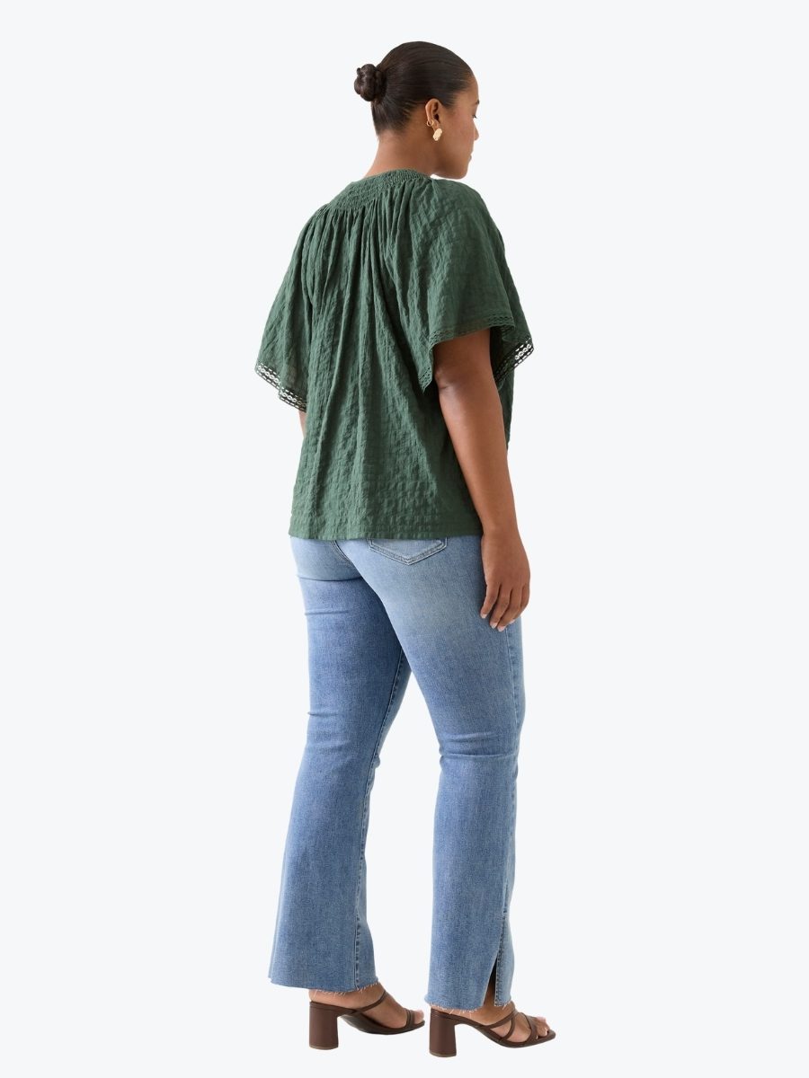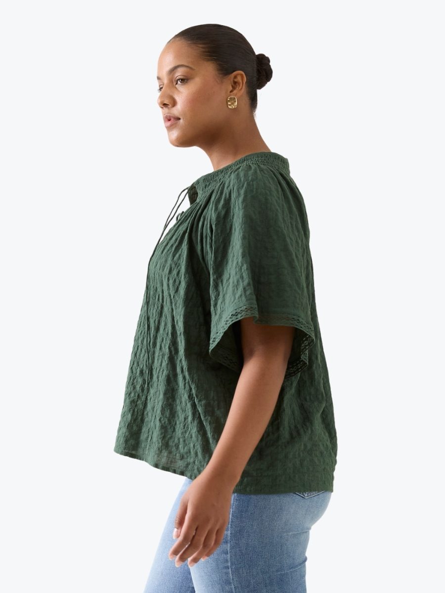 Soft, feminine, and effortlessly flattering – the Esther Shirred Top from Isle of Mine is crafted from a lightweight cotton blend with a textured seersucker finish. Featuring an elasticated shirred neckline, short puff sleeves trimmed in delicate lace, and double tie details for customisable styling, it’s designed to suit a range of body shapes with ease. Pair it with denim or soft neutrals for a naturally elevated everyday look.