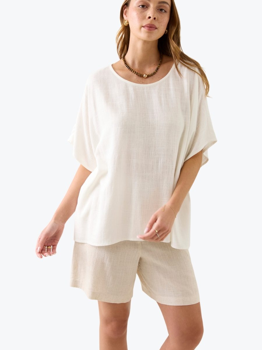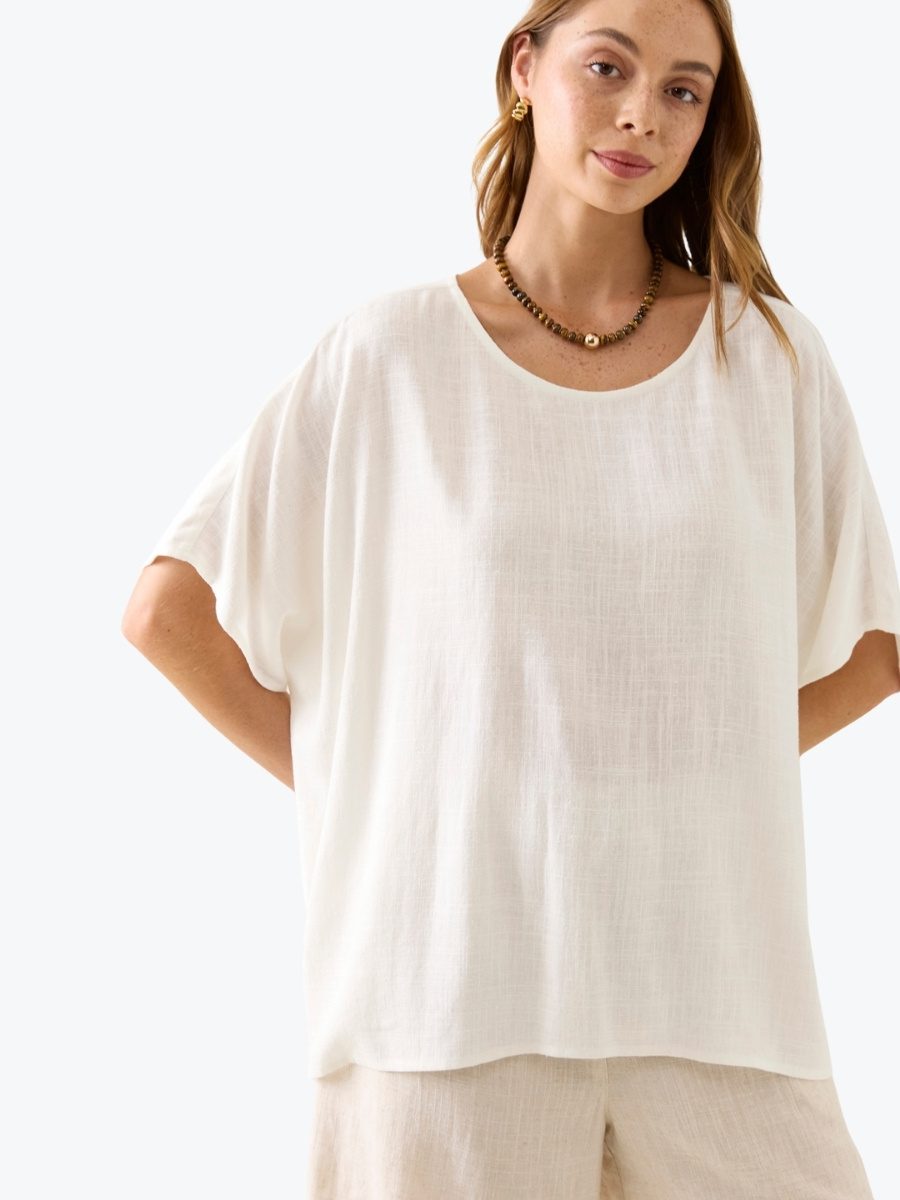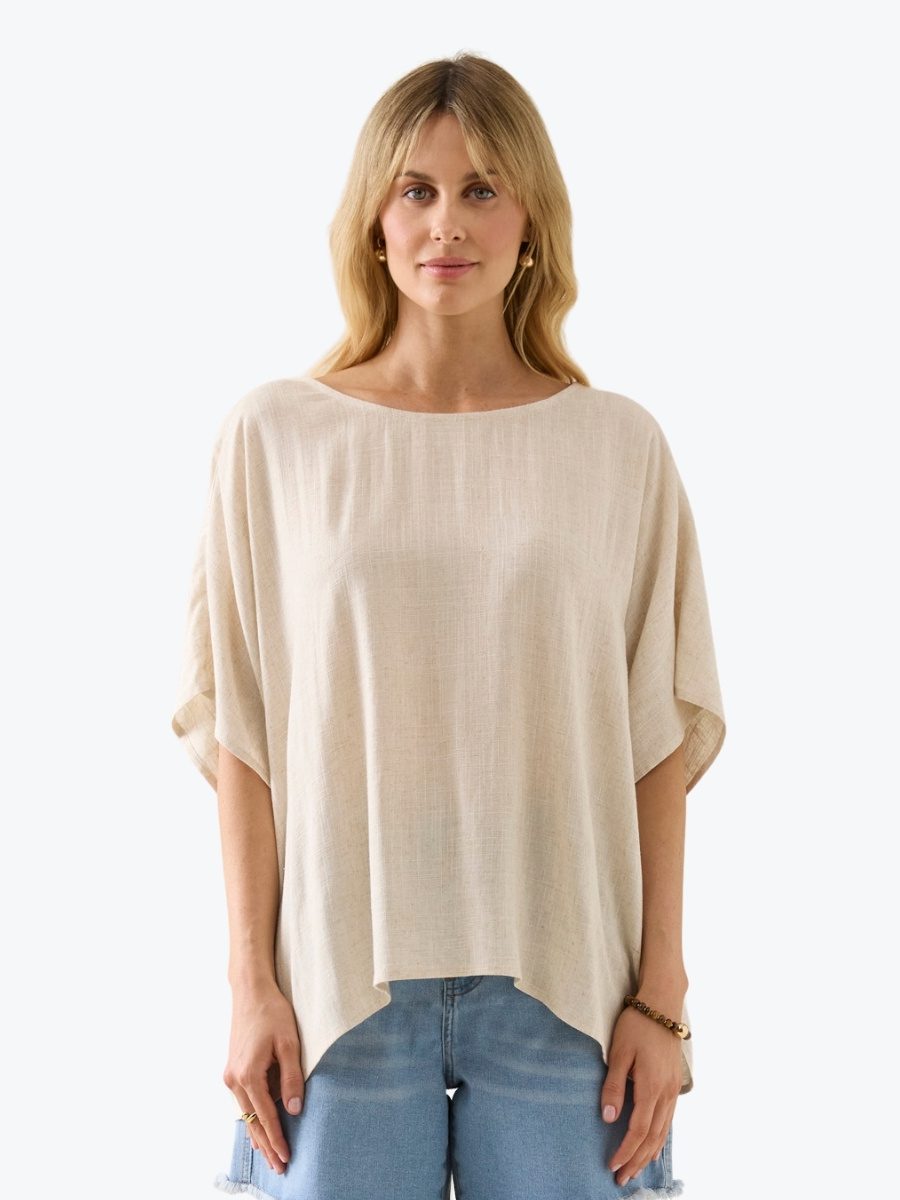 Breezy. Beautiful. Effortless. The Ingrid Relaxed Top from Isle of Mine floats with a relaxed drape and wide short sleeves. Crafted from a soft linen blend, the round neckline and airy silhouette flatter every figure. Just add denim and soft gold accents for everyday elegance.