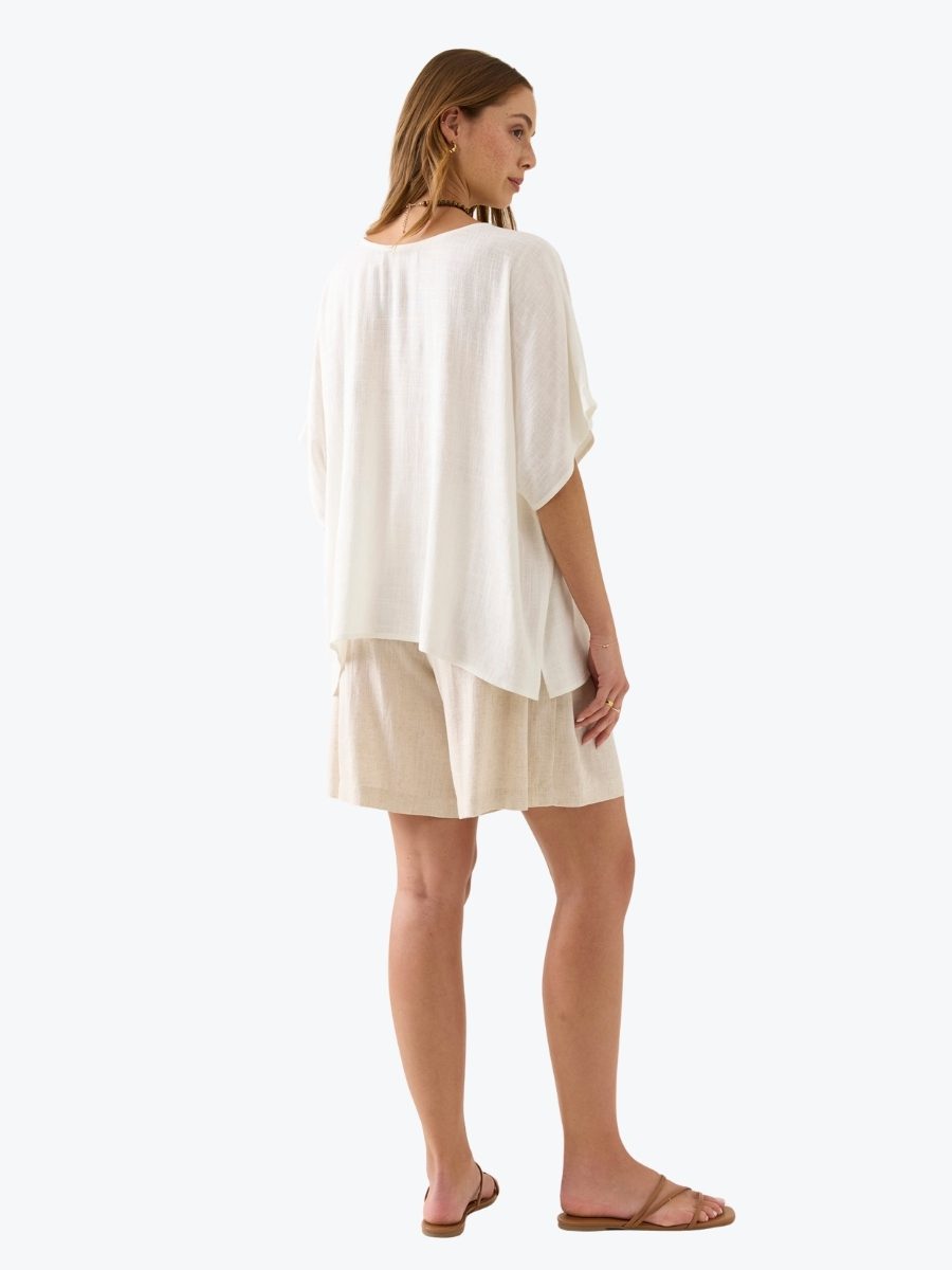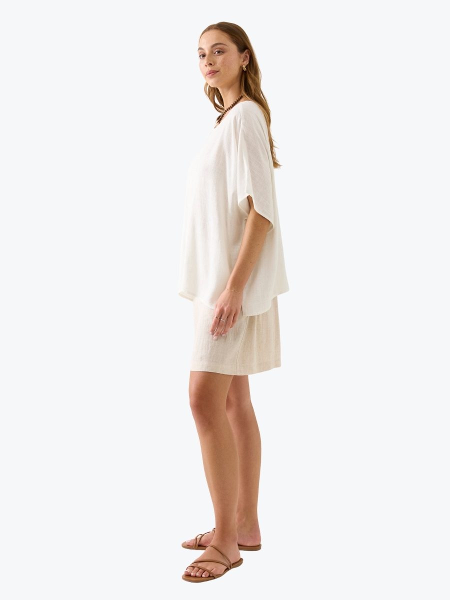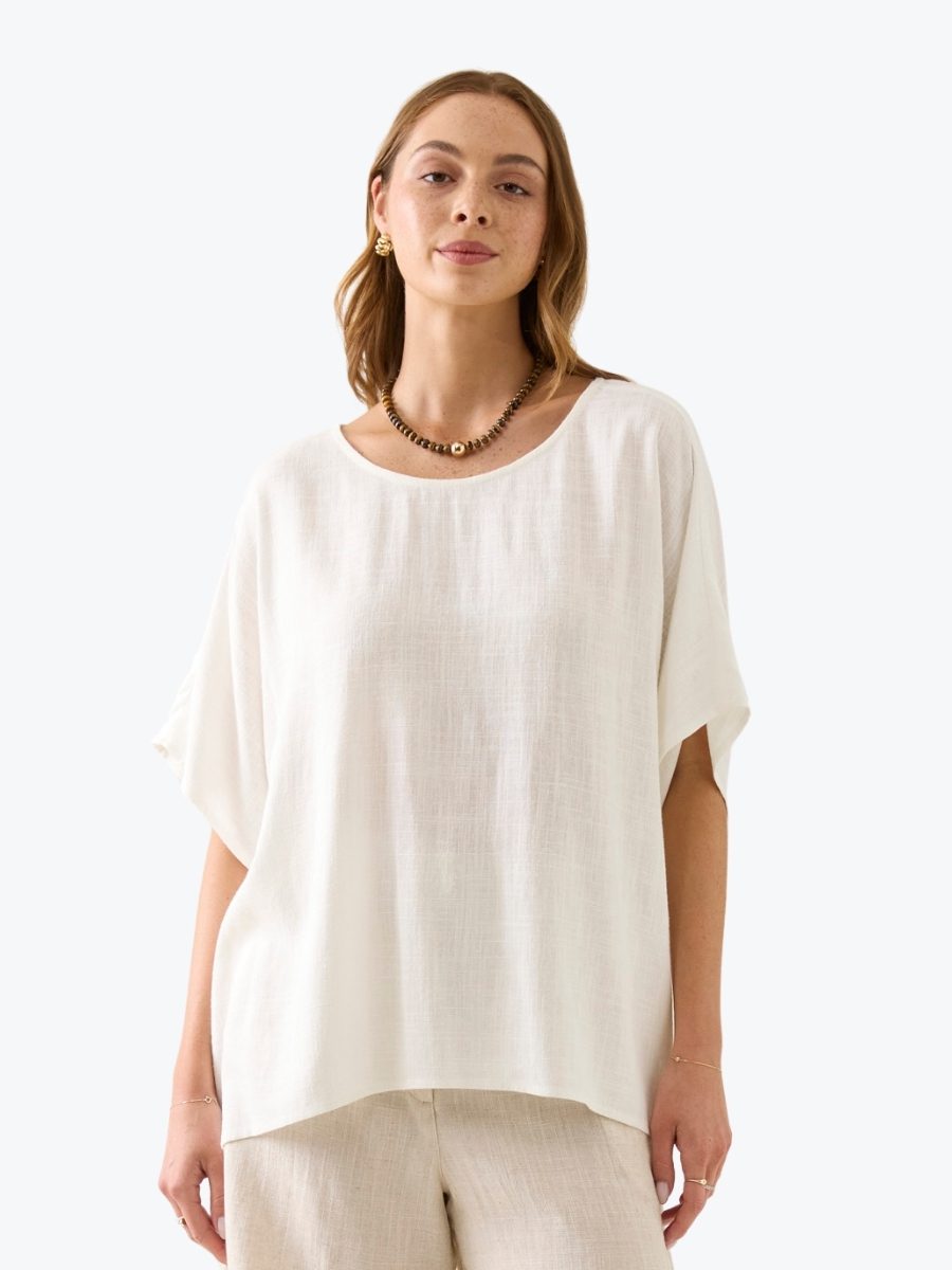 Breezy. Beautiful. Effortless. The Ingrid Relaxed Top from Isle of Mine floats with a relaxed drape and wide short sleeves. Crafted from a soft linen blend, the round neckline and airy silhouette flatter every figure. Just add denim and soft gold accents for everyday elegance.
