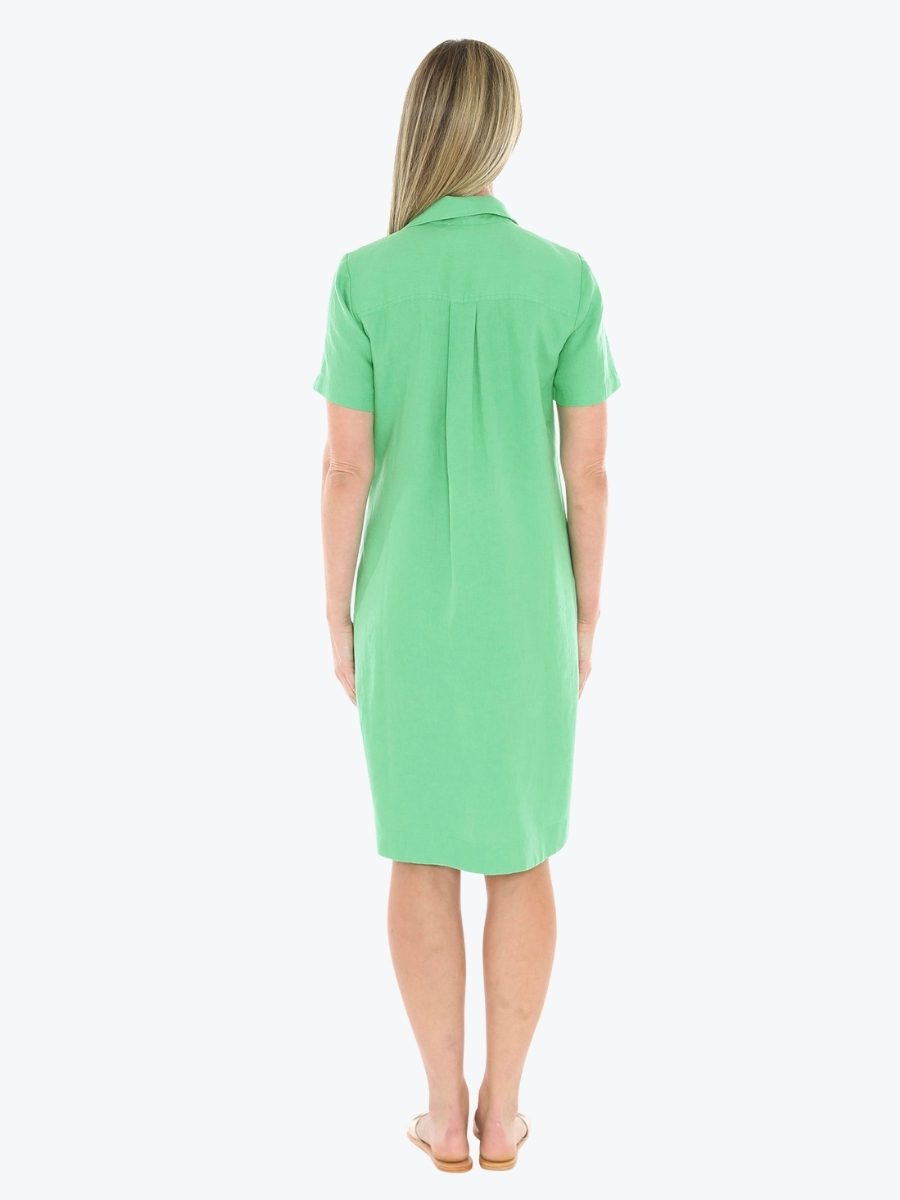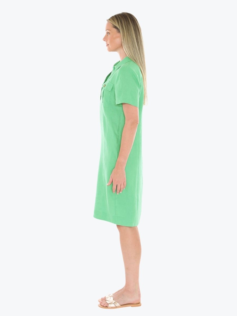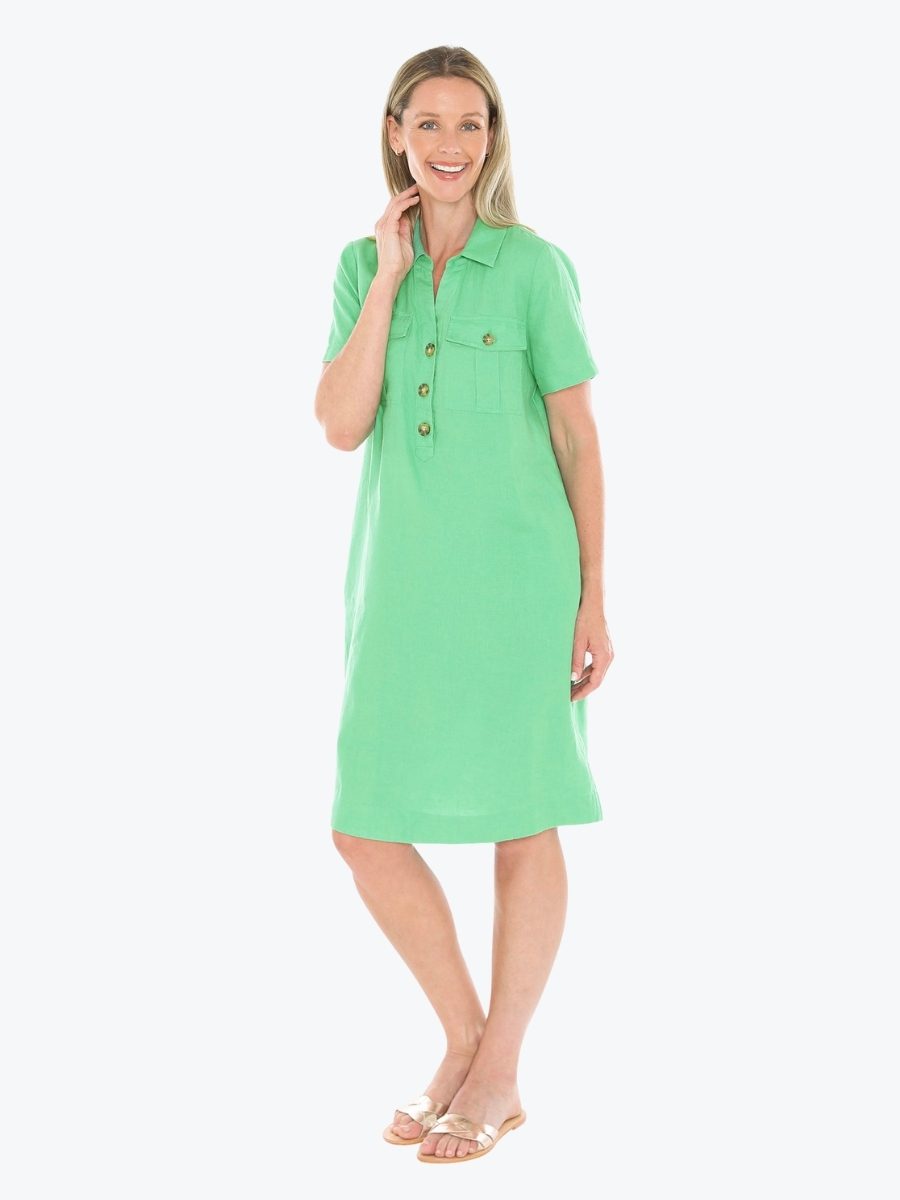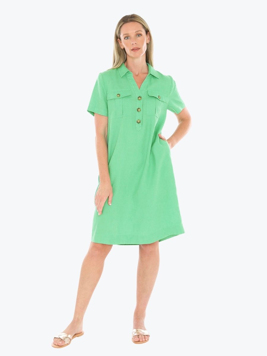 Command comfort with style in the Two Pocket Dress from Jump. This linen shirt dress blends relaxed tailoring with subtle structure, thanks to its shift silhouette and utility-inspired details. The collared V-neckline and exposed button placket add crisp definition, while top stitching and tabbed pockets nod to a modern military vibe – without sacrificing softness. As well as the two button-tab front pockets, there are side pockets for practicality. From desk days to weekend escapes, this dress is ready to go wherever you do – with confidence and ease.