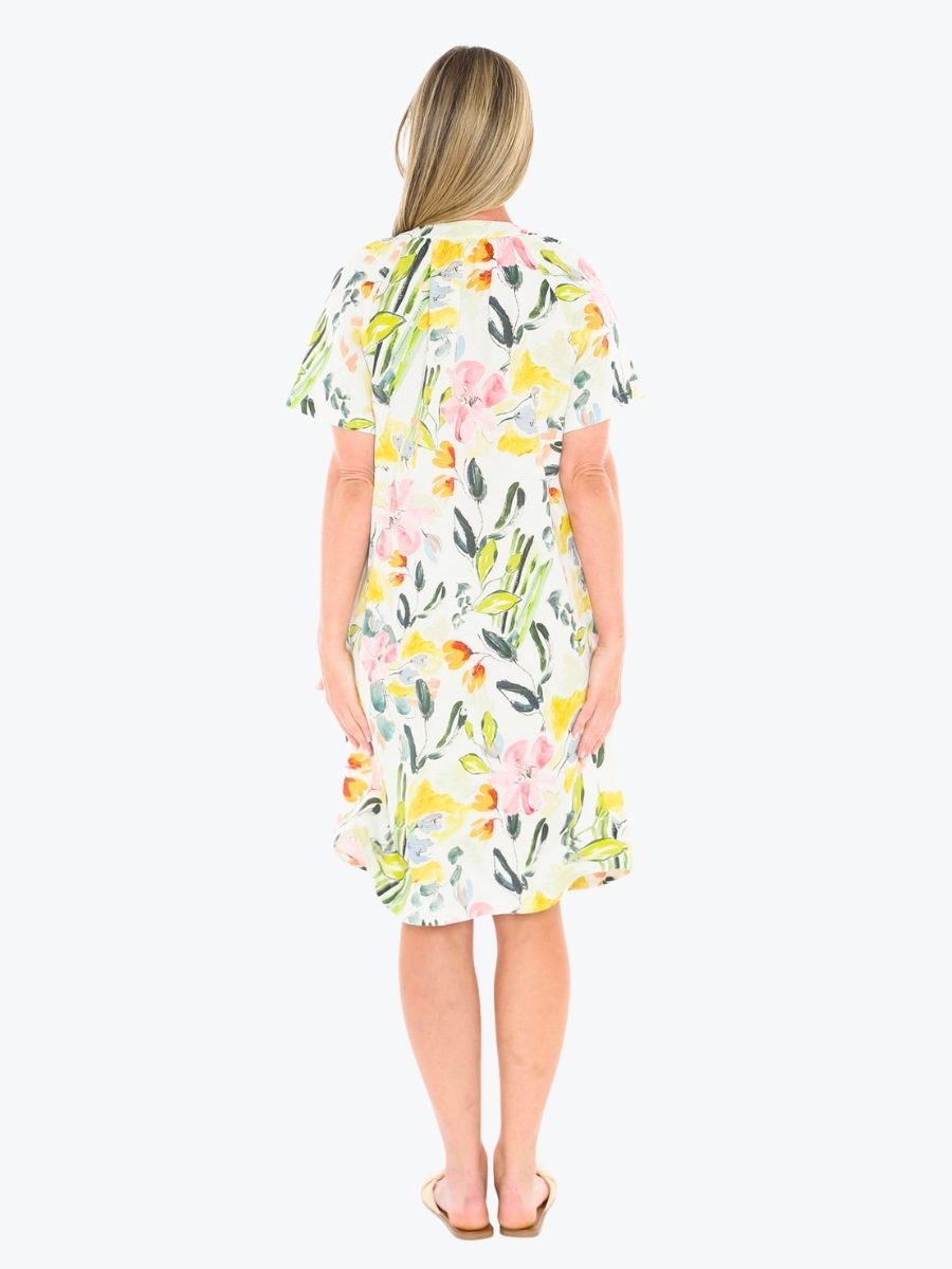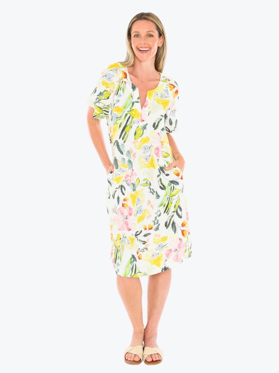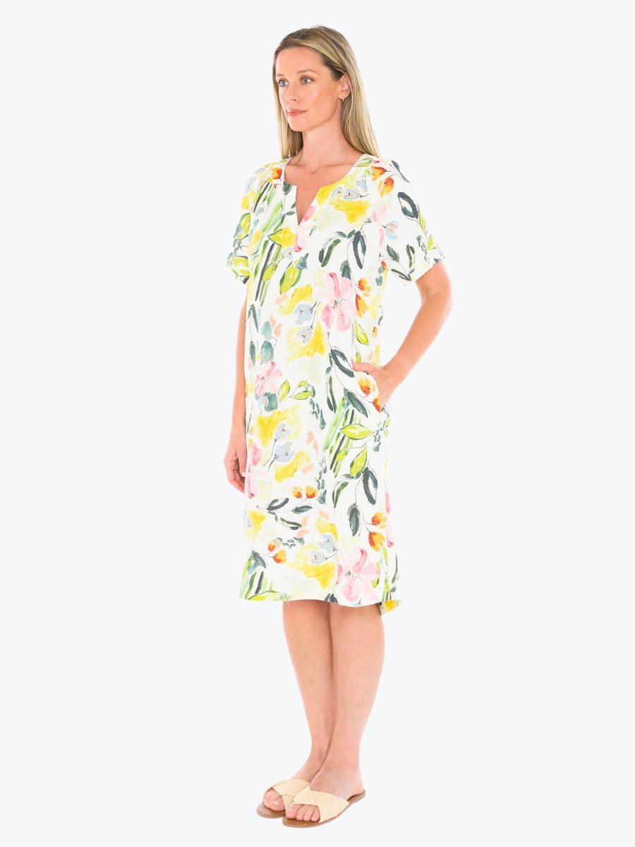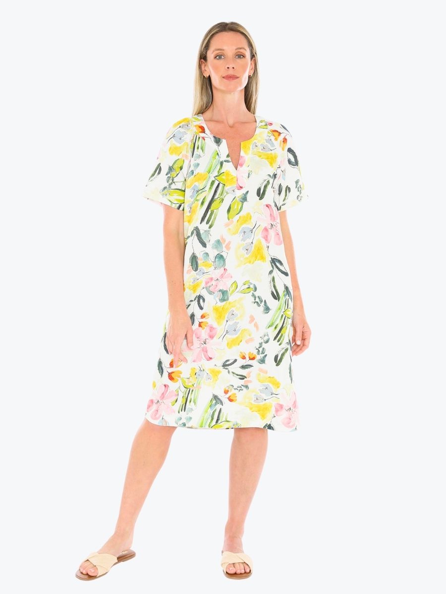 Let your style bloom with the Wildflower Shift Dress from Jump. This breezy shift dress is a celebration of soft colour and graceful movement, with an exlusive delicate floral print that feels like spring in motion. Its relaxed silhouette and breathable linen/viscose blend fabric make it a natural choice for days that call for comfort with a touch of charm. The dress features a split V neckline that gives great coverage, and raglan sleeves for effortless drape. This dress can be elevated with heels or kept casual with sandals – always quietly confident and beautifully versatile.