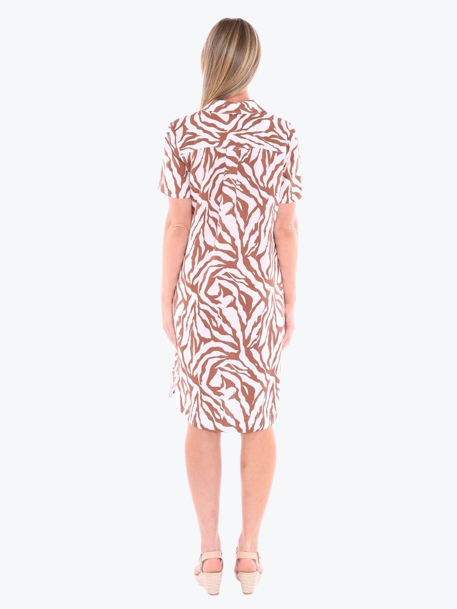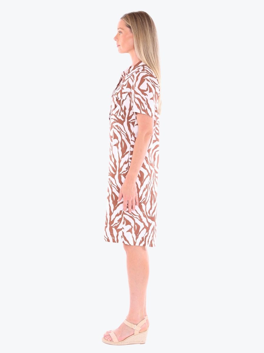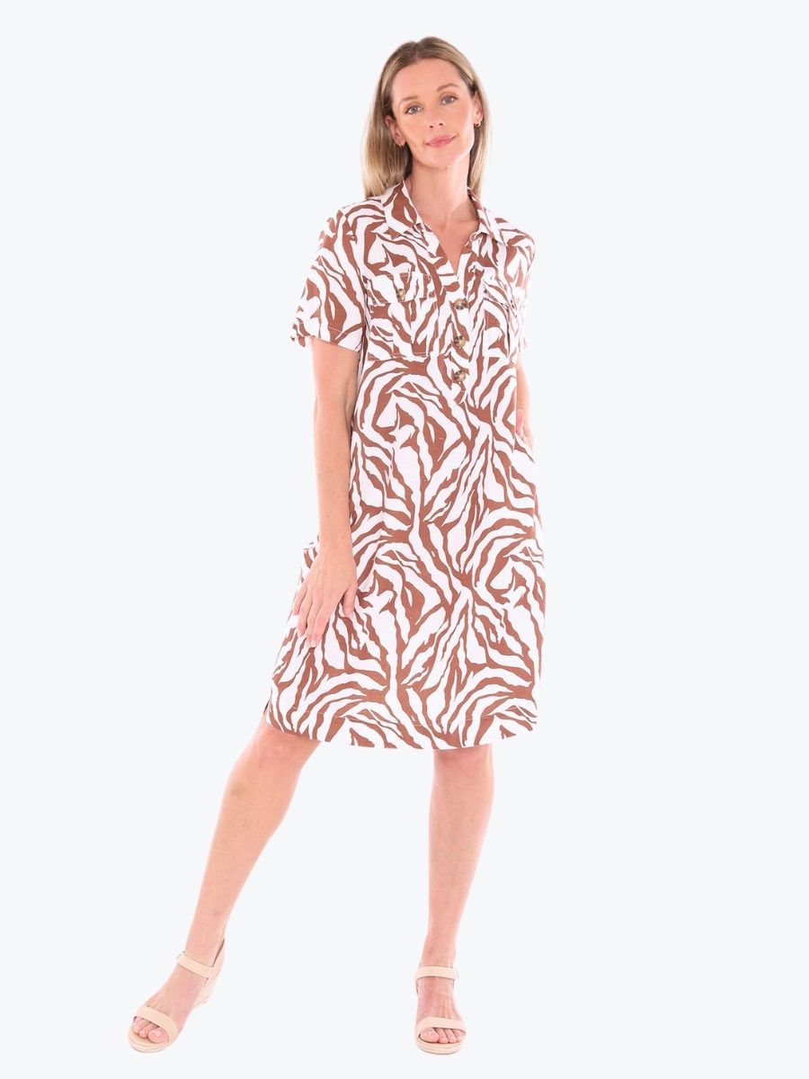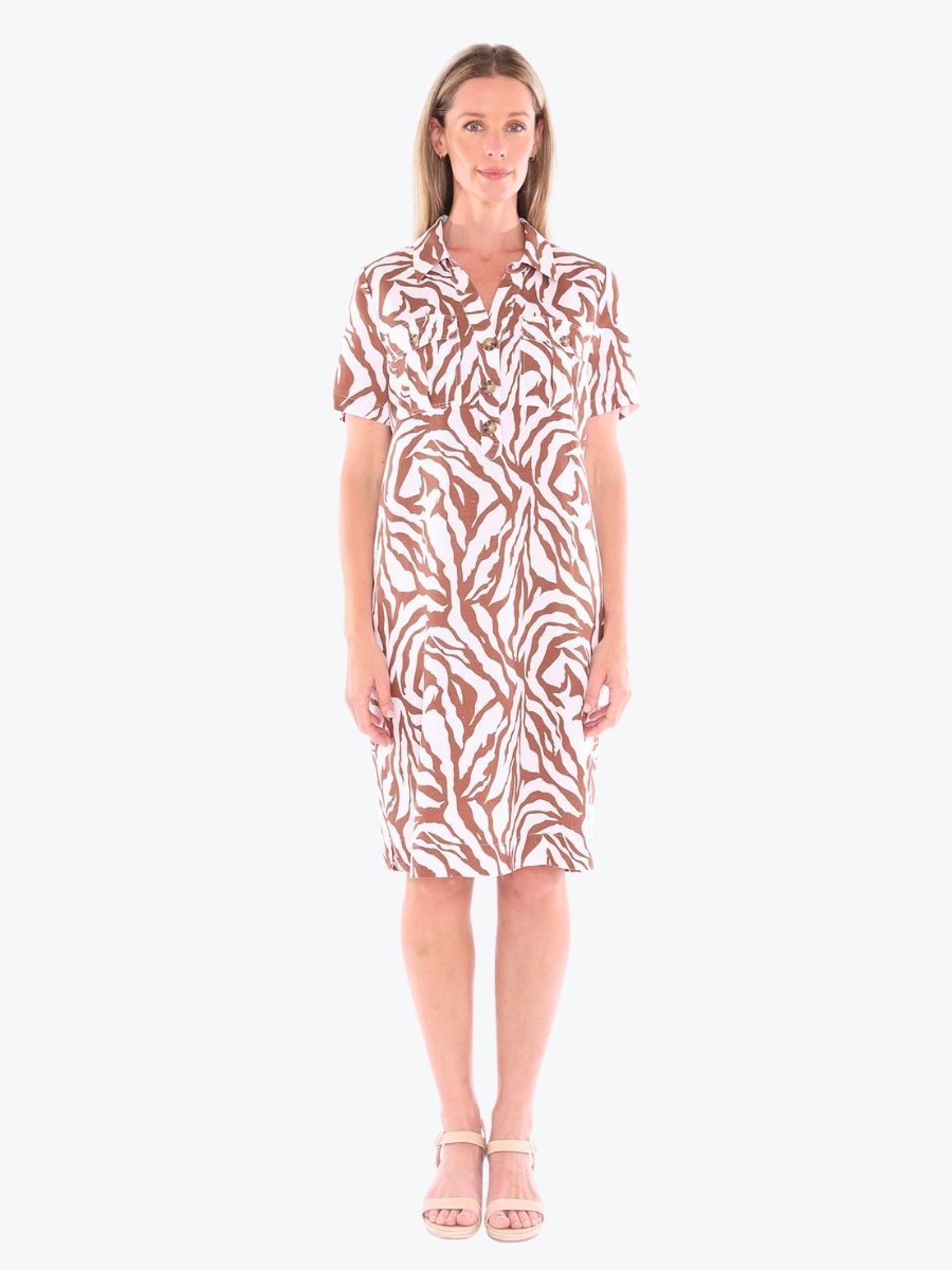 Striking yet simple. The Zebra Mono Dress from Jump brings graphic flair to a relaxed silhouette, offering effortless style with just the right amount of edge. Designed for movement and ease, it’s a wardrobe chameleon – ready to go wherever your day takes you. The dress features a half button placket and collar for a touch of structure, good length short sleeves and front and side pockets for practical charm. It is crafted from Jump’s signature linen/viscose blend fabric, that has fantastic softness and breathability. It is designed to be around knee length on most. Style it with slides for daytime ease or elevate with heels – this dress is made to stand out, softly.