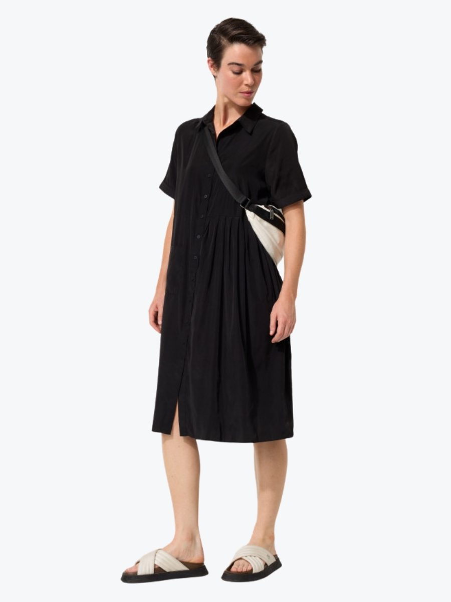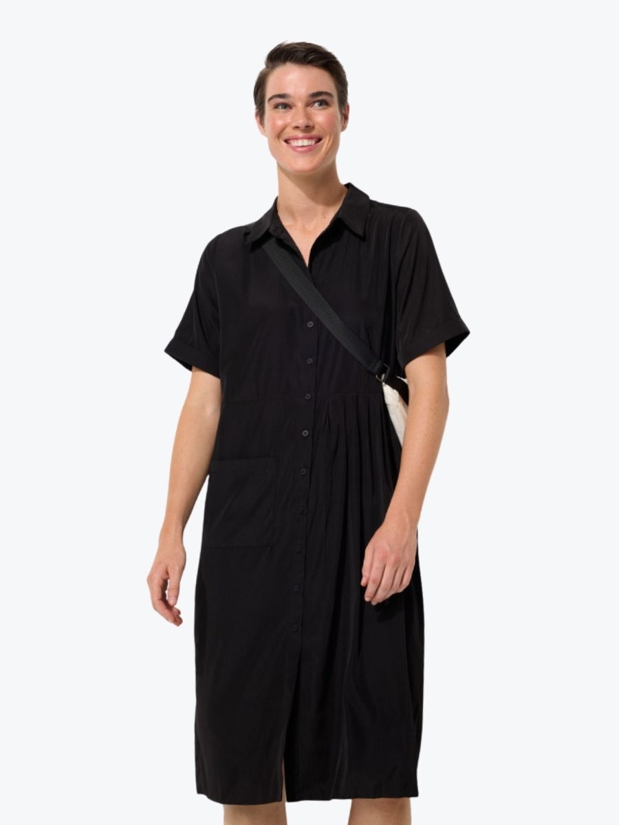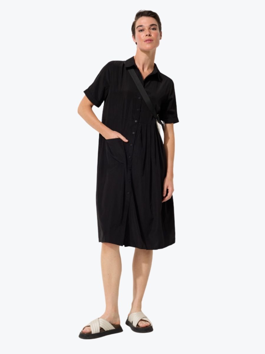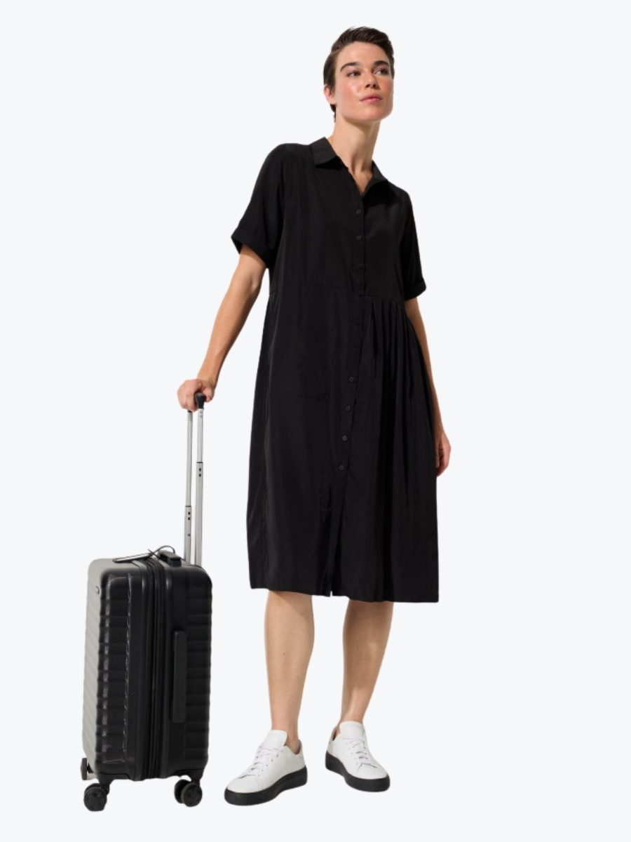 Designed for life on the go, the Crushed Travel Dress from Marco Polo blends effortless style with everyday function. Crafted from a lightweight viscose blend with a naturally crinkled texture, it resists creasing so you can skip the iron and stay polished. The shirt collar and full button-through front offer timeless structure, while short turned-up sleeves and a handy patch pocket add relaxed ease. Designed to fall just below the knee, it’s the kind of piece that pairs seamlessly with flats, sandals, or sneakers. Whether packed for a getaway or worn on repeat, it transitions beautifully from casual to elevated, and is a must on your next trip.
