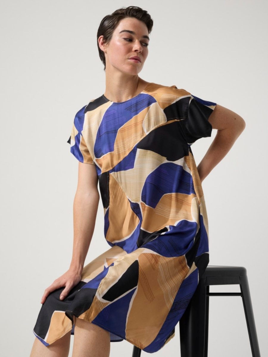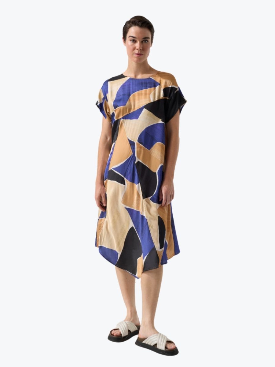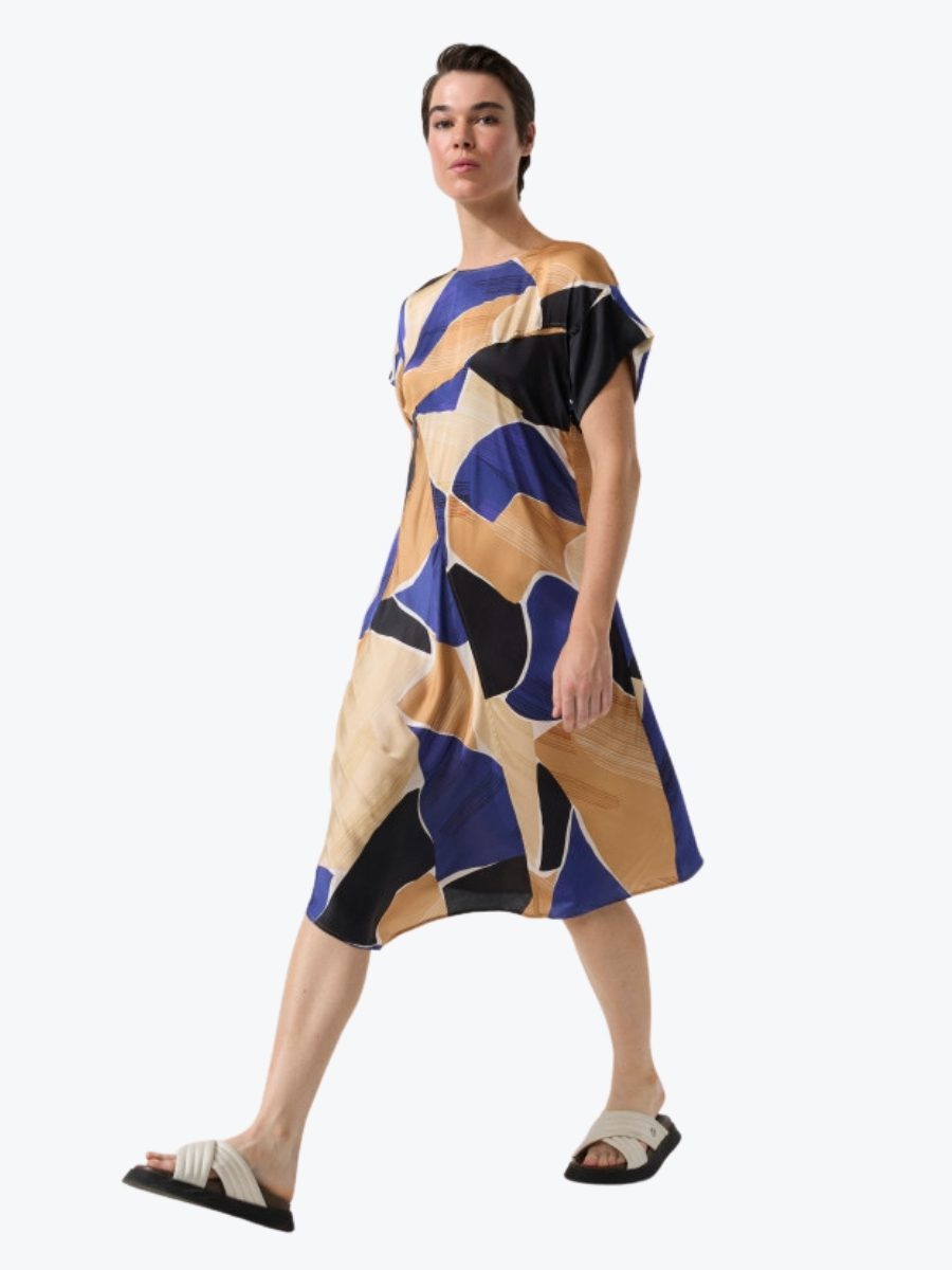 Shape, flow and drame – the Precious Gem Dress from Marco Polo is designed to move with you. The relaxed fit and asymmetrical hemline create a sense of effortless motion, while the short sleeves and knee-length cut keep things breezy and wearable. Its abstract geometric pattern on a soft viscose fabric adds visual intrigue without overpowering, making it a standout piece that still feels grounded. Whether you’re heading to a gallery opening or just elevating your everyday, this dress brings artful ease to any occasion. Slip it on, step out, and let the silhouette do the talking.