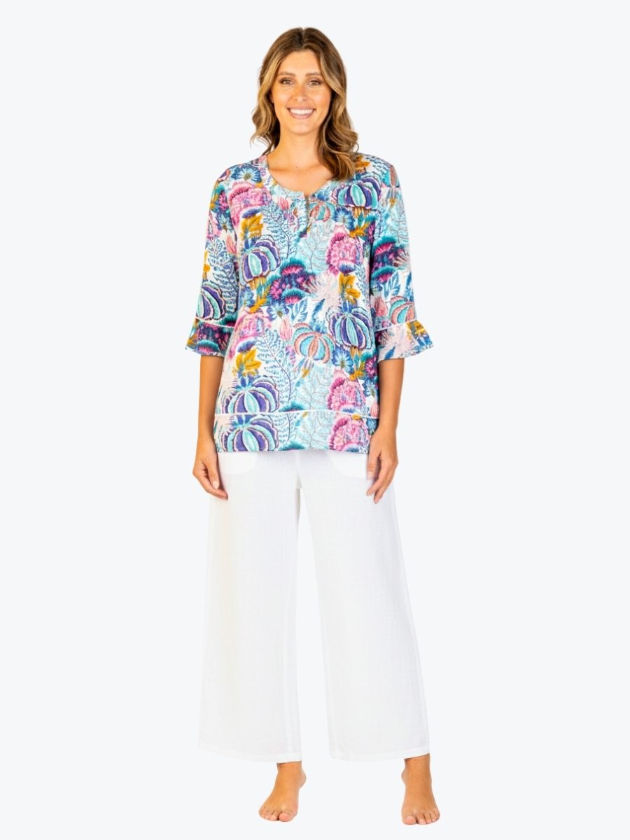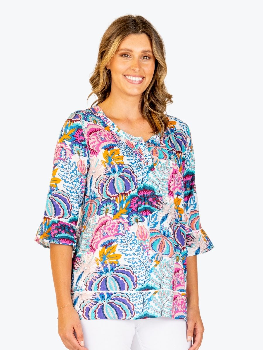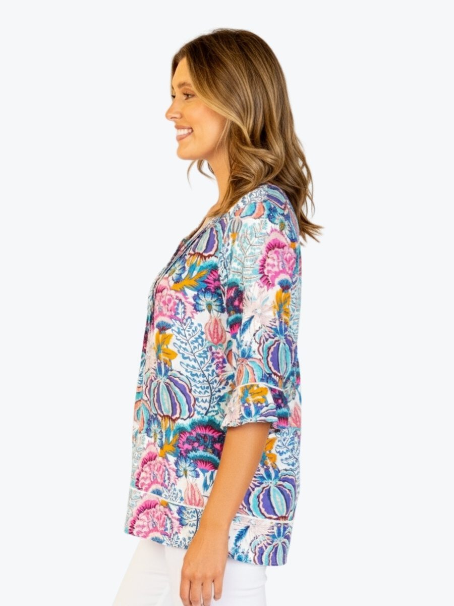 Vibrant, feminine, and full of personality. The Pintuck Top from Renoma is your go-to for effortless style with a splash of colour. Crafted from lightweight 100% cotton fabric, it features a joyful mix of florals and abstract hues in blues, purples and pinks that instantly lift your look. This relaxed top features a round neckline with three buttons for easy access, while flattering soft pintucks add gentle structure and movement. Three quarter sleeves with a softly ruffled cuffs bring a playful finish, perfect for warm days and relaxed outings. Pair this top with white pants and sandals for a fresh, sun-ready look that feels polished yet playful.