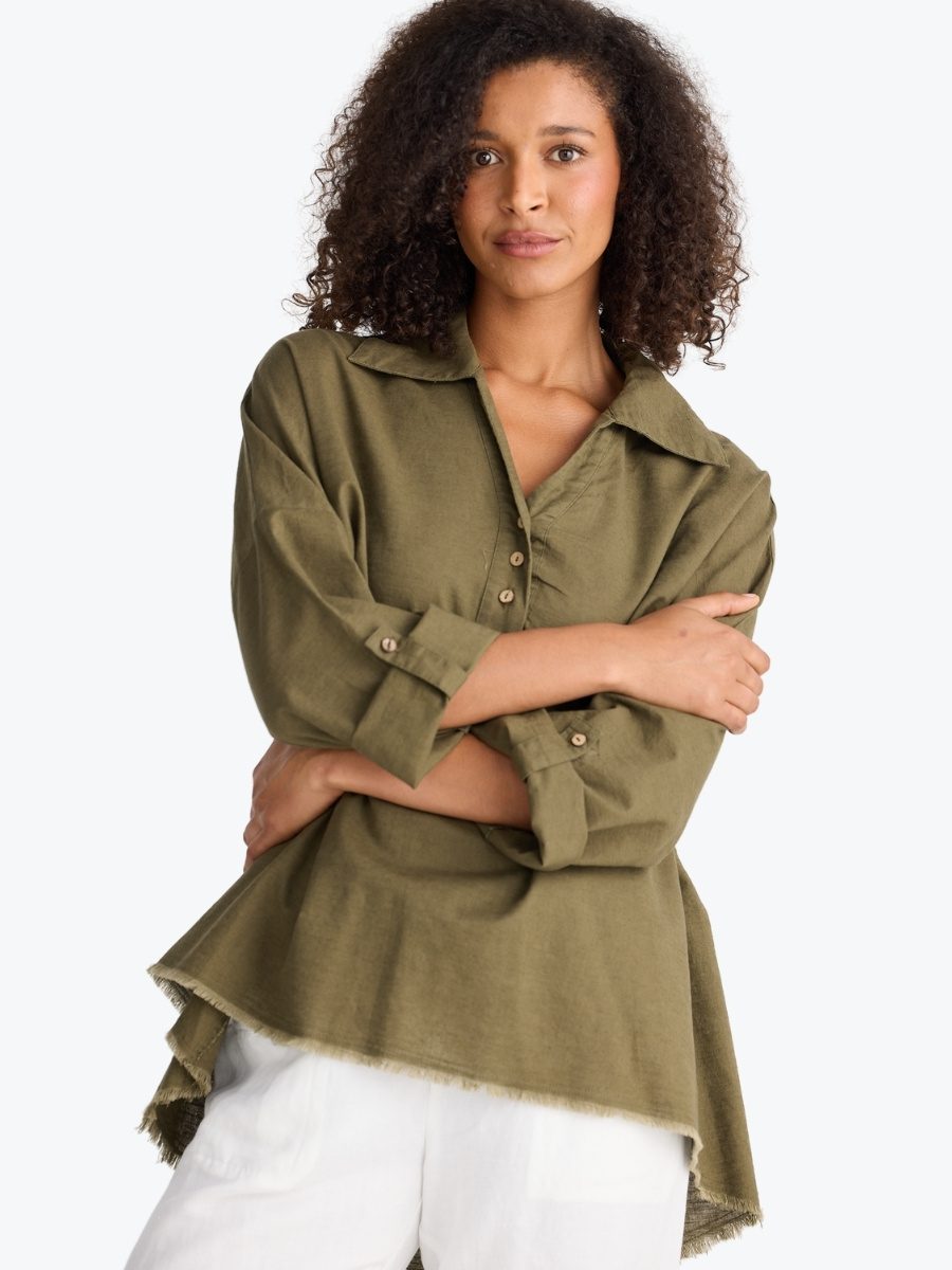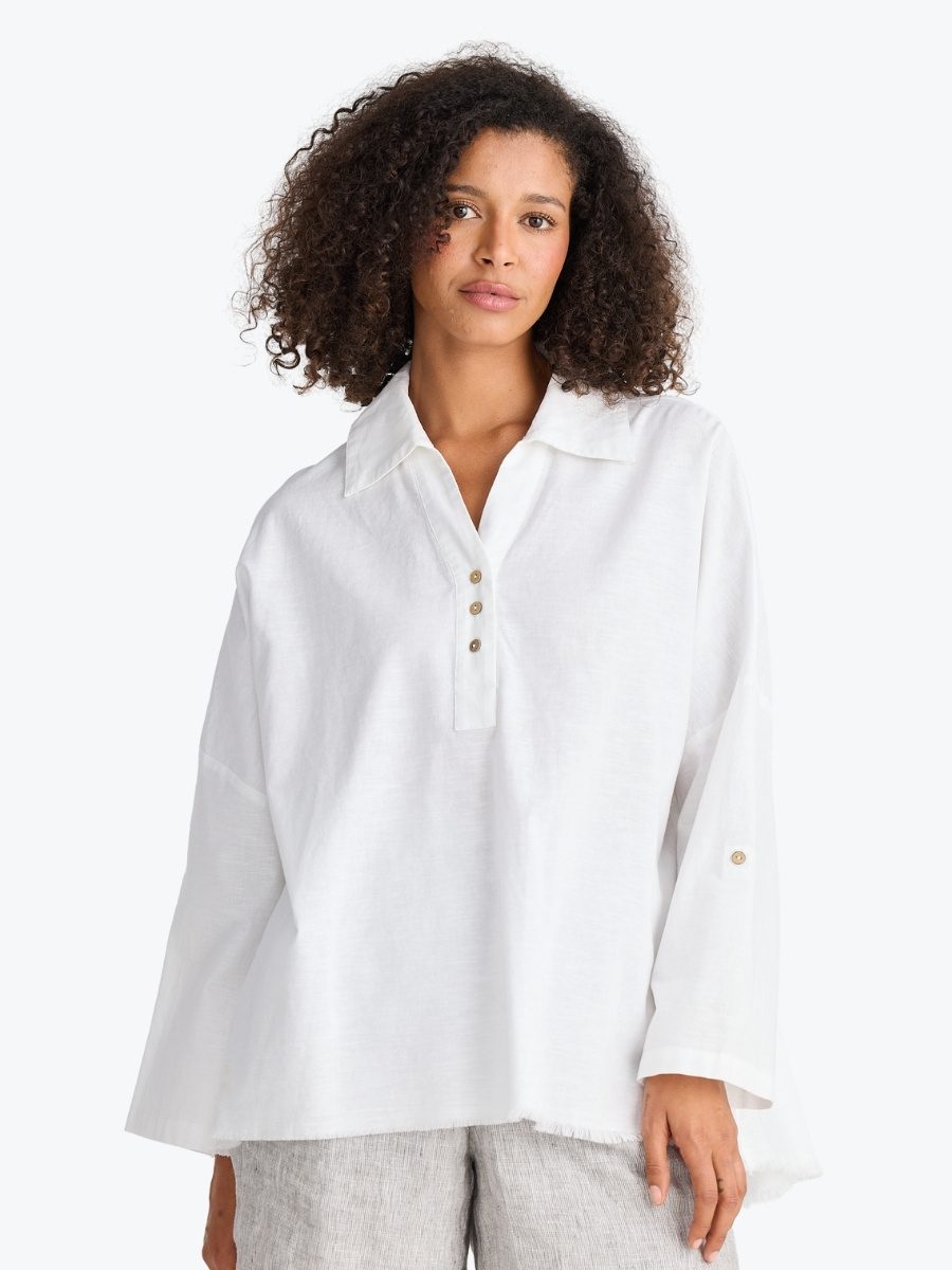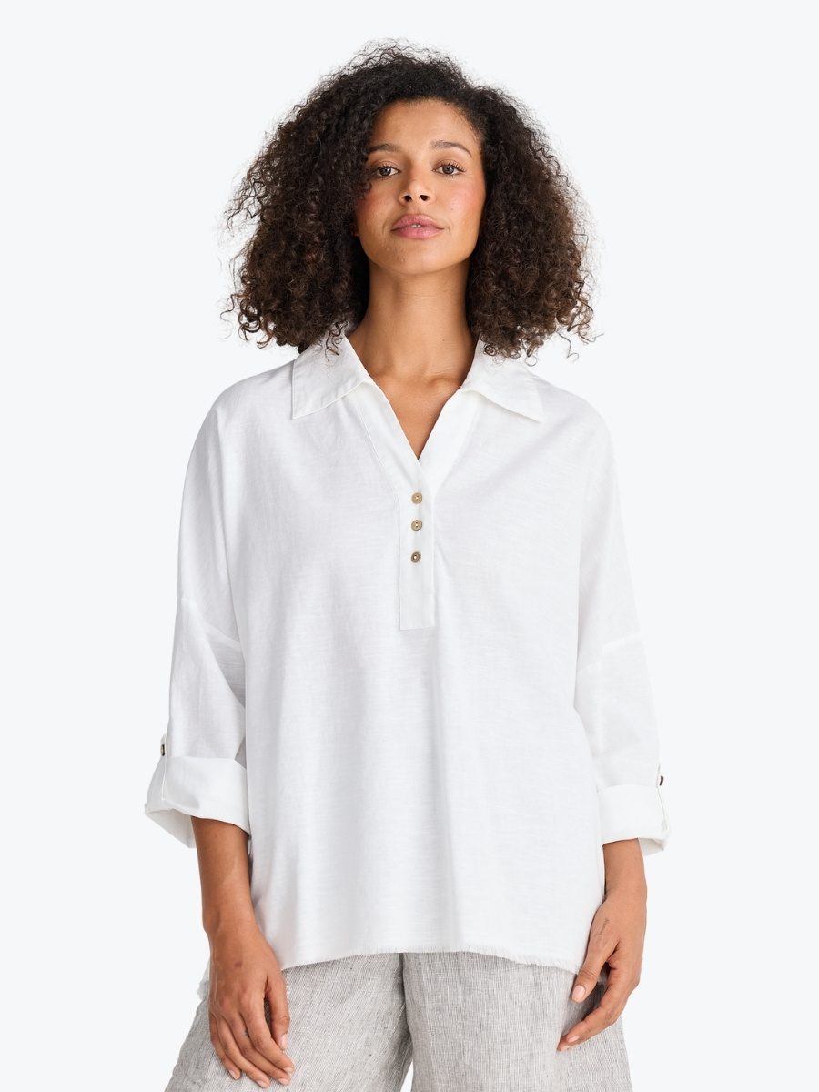 No fuss, all finesse – the Amar Shirt from The Shanty Corporation is back! This shape is a proven winner, with the feature detail being the gathered elastic at the back which subtly shapes your silhouette. Made from a high quality cotton/linen blend that feels so luxurious, this shirt also features a roll collar with half placket, and rolled sleeves for versatility. The boxy fit gives you room to breathe, making this shirt perfect to throw on over jeans or linen pants to look effortlessly put together.