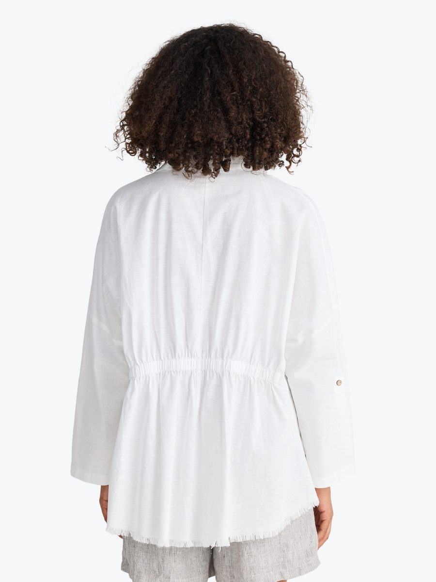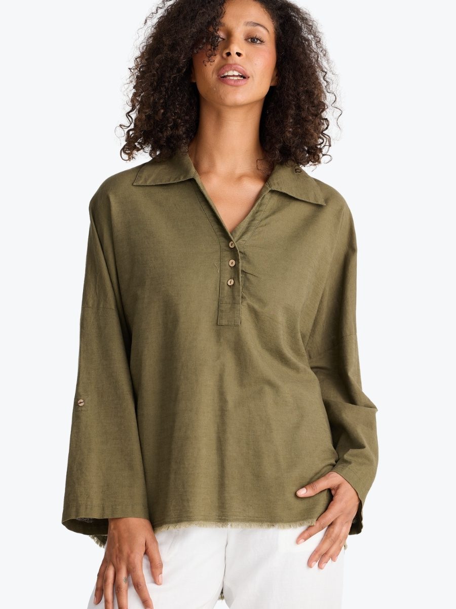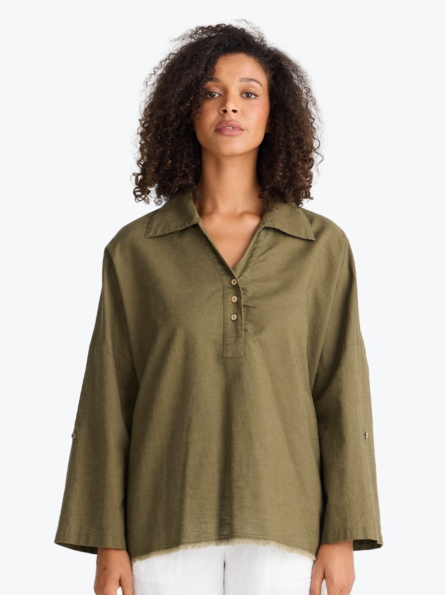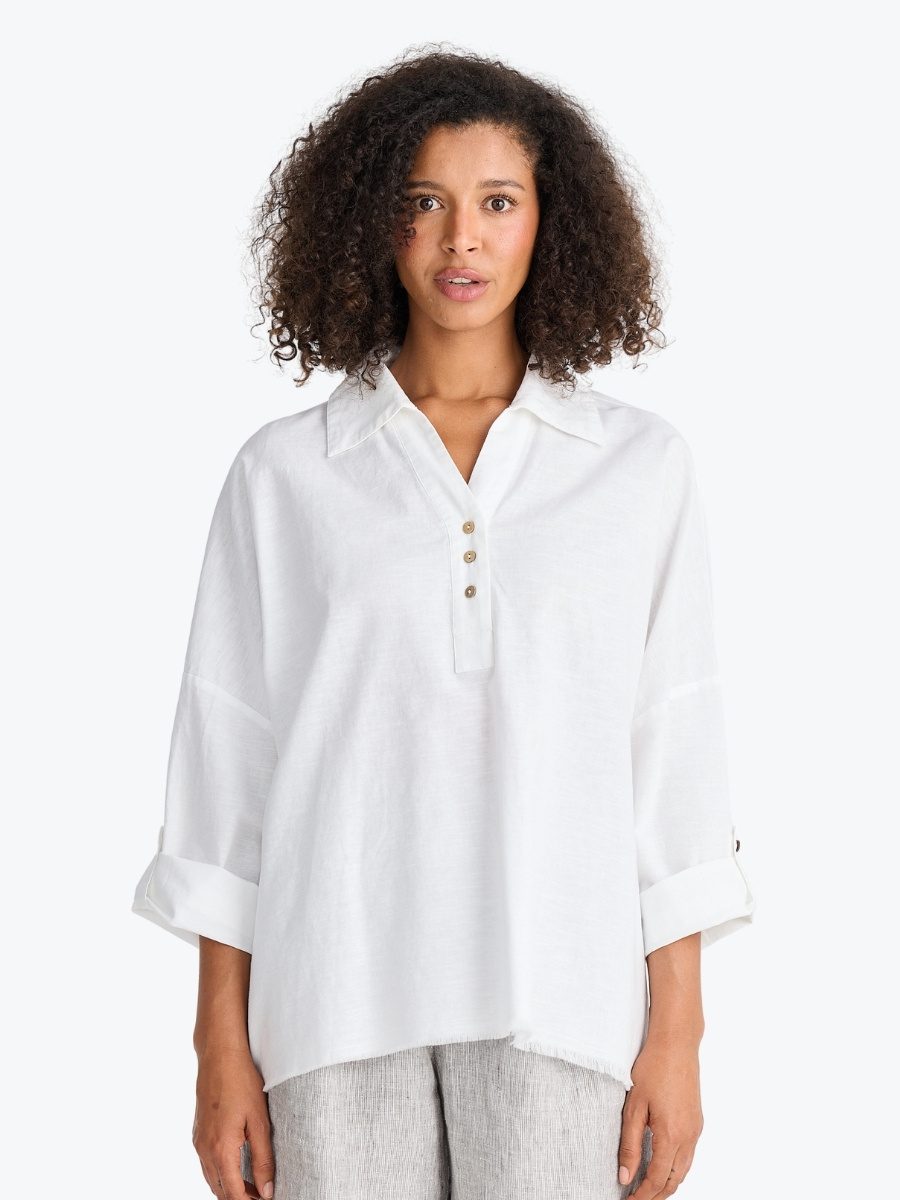 No fuss, all finesse – the Amar Shirt from The Shanty Corporation is back! This shape is a proven winner, with the feature detail being the gathered elastic at the back which subtly shapes your silhouette. Made from a high quality cotton/linen blend that feels so luxurious, this shirt also features a roll collar with half placket, and rolled sleeves for versatility. The boxy fit gives you room to breathe, making this shirt perfect to throw on over jeans or linen pants to look effortlessly put together.