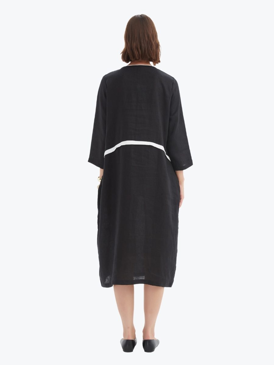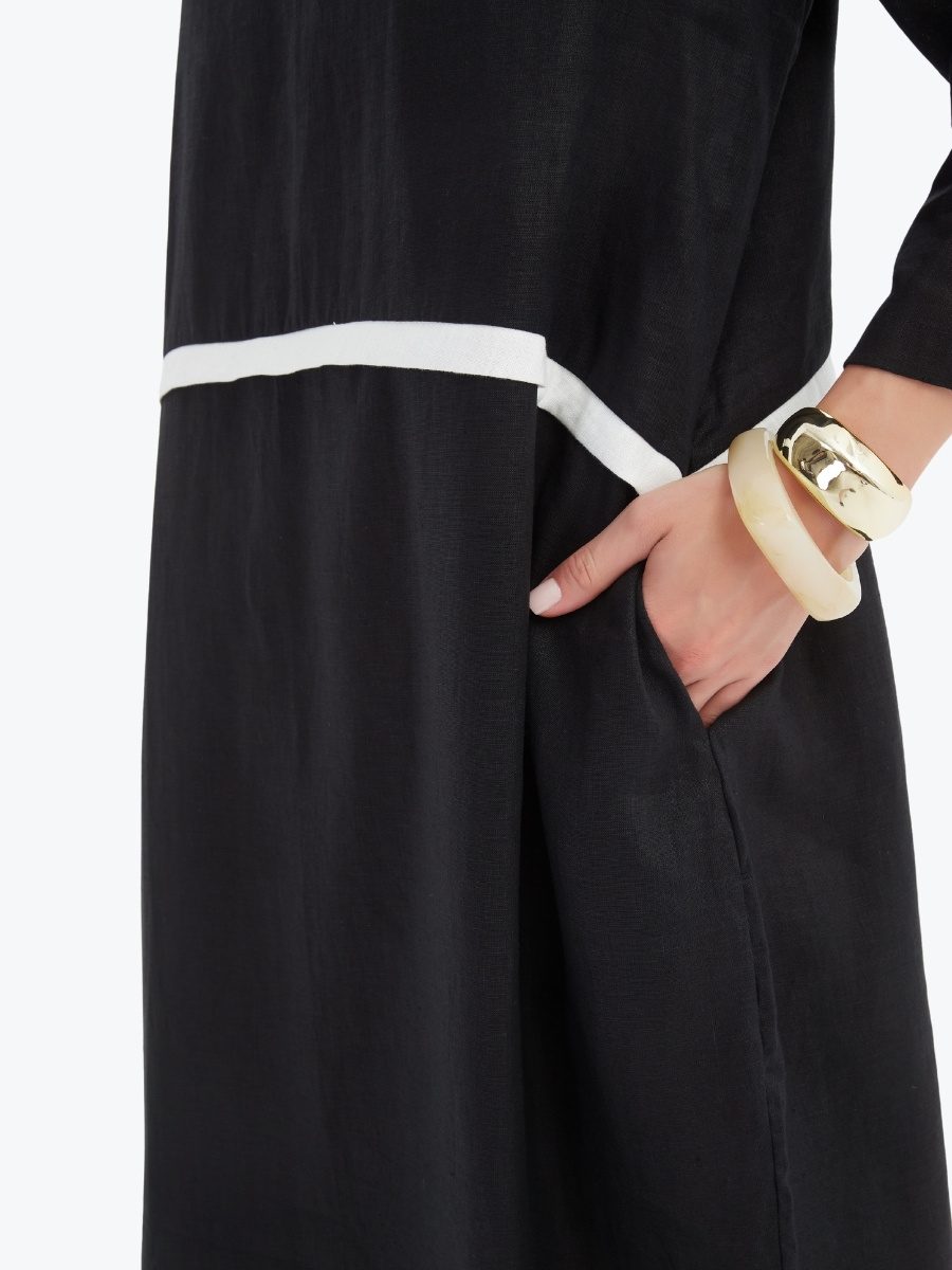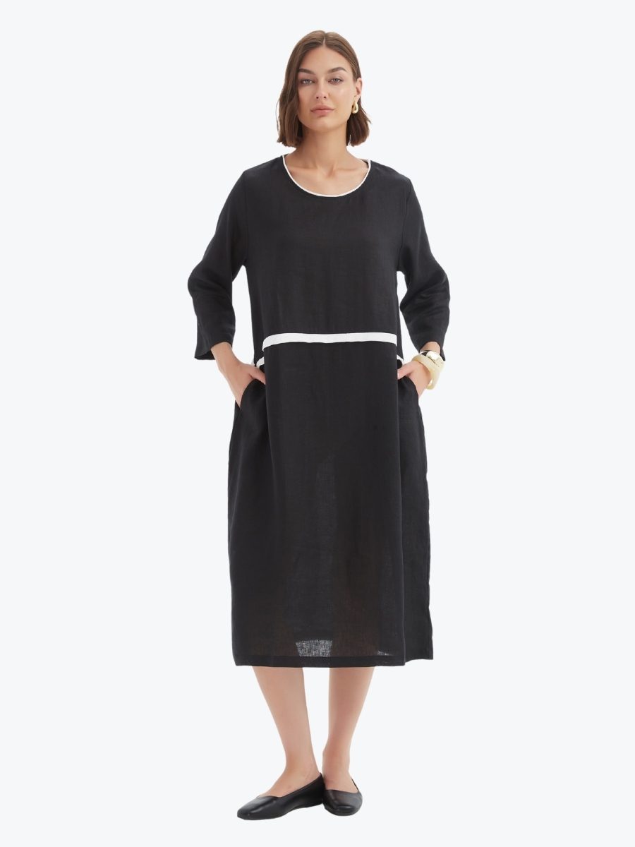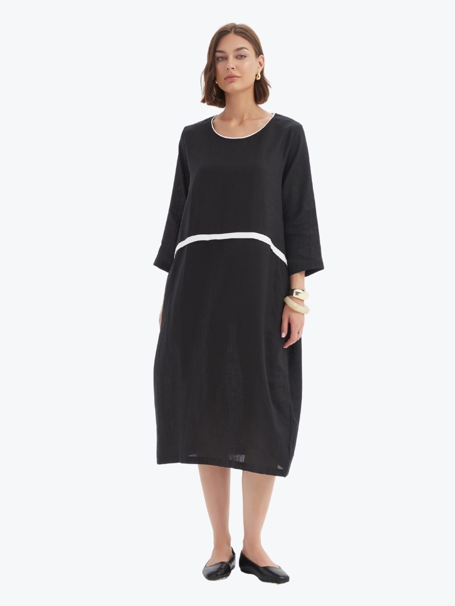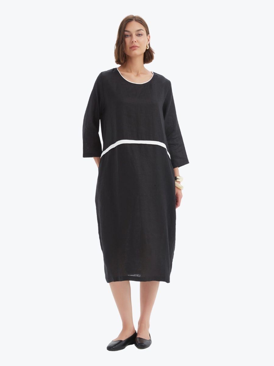 Effortless refinement – the Contrast Trim Oviod Dress from Tirelli. A study in understated sophistication, this black midi length dress is designed to flatter and flow. Crafted from Tirelli’s luxe 100% French linen fabric, it features a graceful three-quarter sleeve and a relaxed silhouette that moves with ease. The crisp white trim at the neckline and waist adds a modern, graphic touch – subtle yet striking. With discreet pockets and a clean finish, it’s the kind of piece that transitions seamlessly from more casual to dressy occasions.